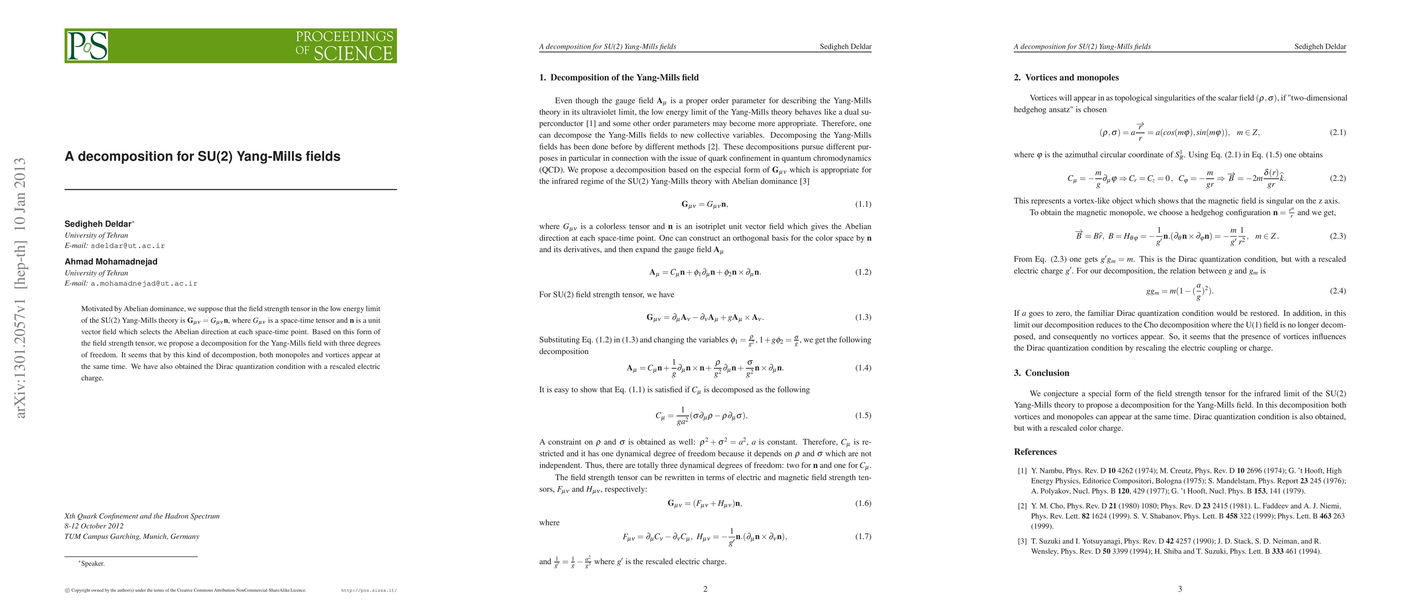 This paper proposes a decomposition for SU(2) Yang-Mills fields based on the Abelian dominance principle, suggesting that the field strength tensor can be expressed as a product involving a unit vector field that selects an Abelian direction. This decomposition reveals the simultaneous presence of monopoles and vortices, and leads to a Dirac quantization condition with a rescaled electric charge.