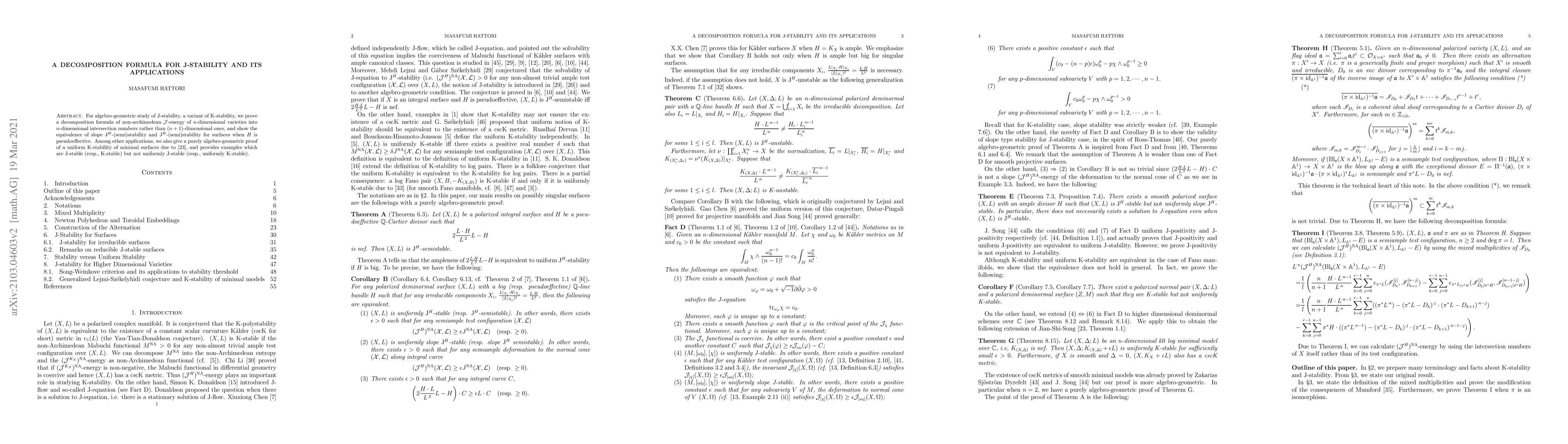 For algebro-geometric study of J-stability, a variant of K-stability, we prove a decomposition formula of non-archimedean $\mathcal{J}$-energy of $n$-dimensional varieties into $n$-dimensional intersection numbers rather than $(n+1)$-dimensional ones, and show the equivalence of slope $\mathrm{J}^H$-(semi)stability and $\mathrm{J}^H$-(semi)stability for surfaces when $H$ is pseudoeffective. Among other applications, we also give a purely algebro-geometric proof of a uniform K-stability of minimal surfaces due to [23], and provides examples which are J-stable (resp., K-stable) but not uniformly J-stable (resp., uniformly K-stable).