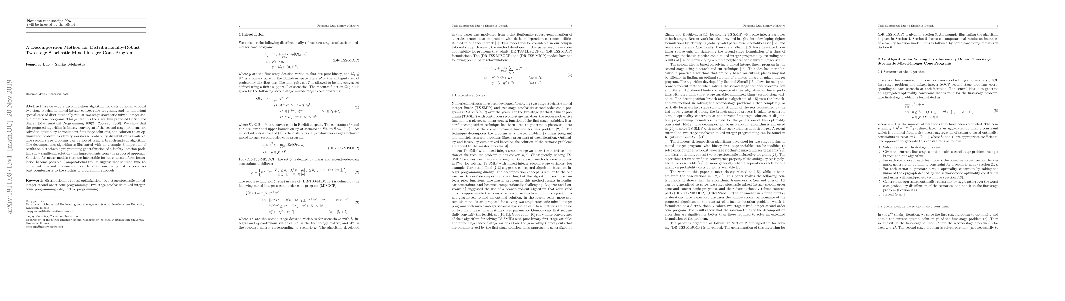 This paper proposes a decomposition algorithm for distributionally-robust two-stage stochastic mixed-integer convex cone programs, demonstrating its convergence and effectiveness through a branch-and-cut approach, and showing significant improvements in solution times for a generalized facility location problem.