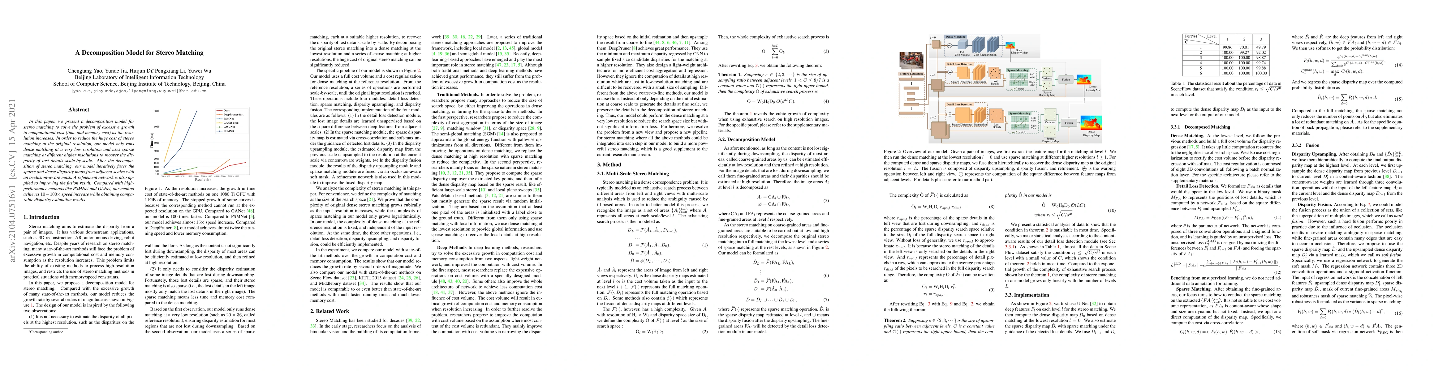 This paper proposes a decomposition model for stereo matching that significantly reduces computational cost by performing dense matching at low resolution and sparse matching at higher resolutions to recover lost details. The method achieves substantial speed improvements while maintaining comparable disparity estimation accuracy to high-performance methods.