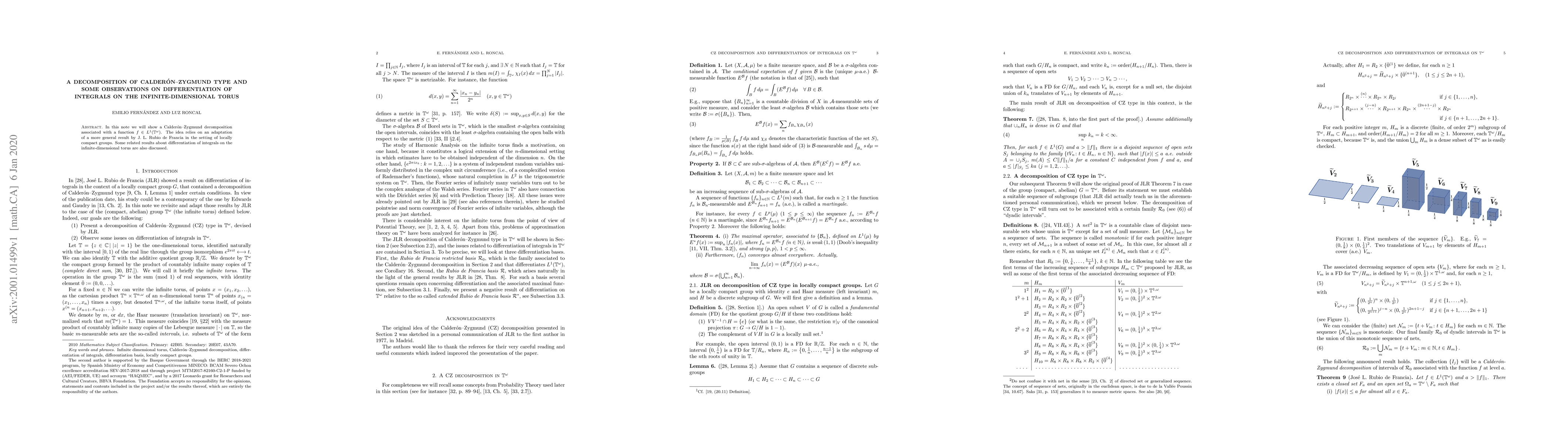 This paper presents a Calder\'on--Zygmund decomposition for a function $f\in L^1(\mathbb{T}^{\omega})$, adapting a result by Rubio de Francia for locally compact groups. Additionally, it explores related differentiation properties of integrals on the infinite-dimensional torus.