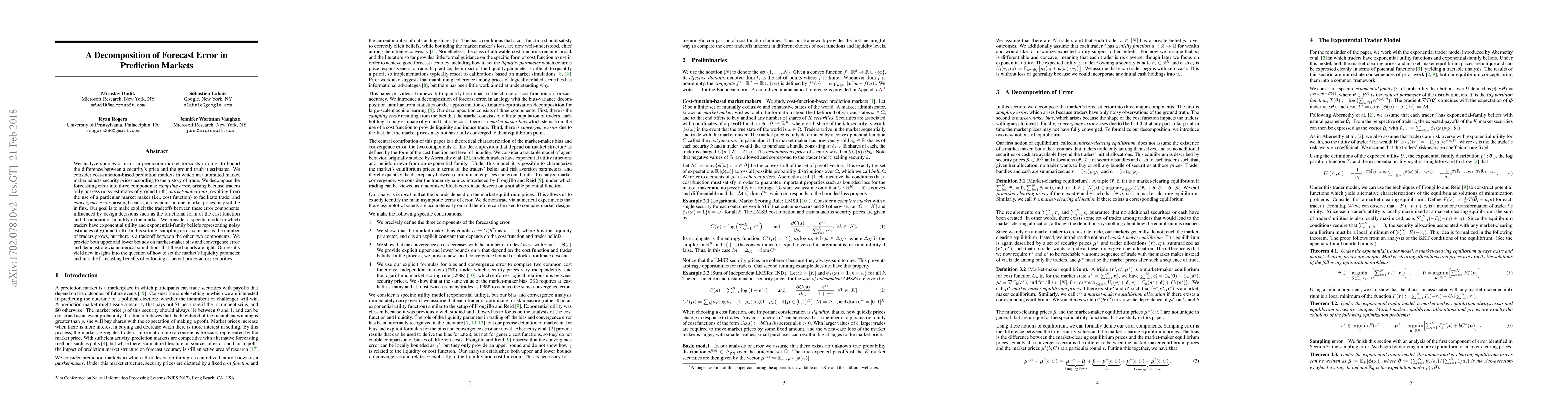 A new study analyzes error sources in prediction markets, decomposing forecast error into sampling, market-maker bias, and convergence errors, providing bounds on these components to inform design decisions.