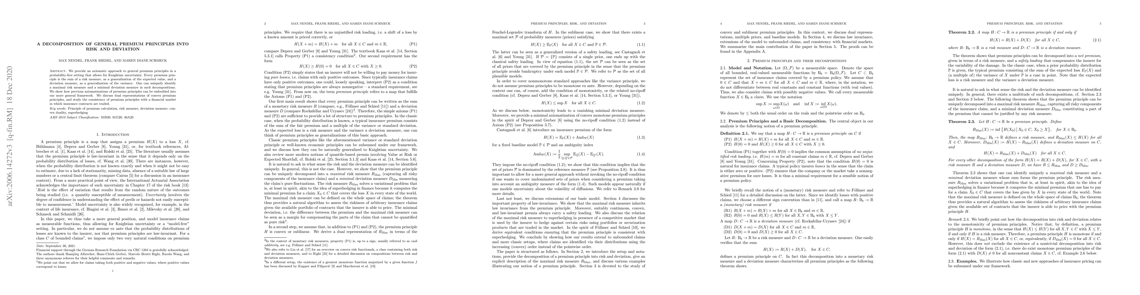 This paper decomposes general premium principles into a risk measure and a deviation measure, providing a probability-free axiomatic framework for Knightian uncertainty. It uniquely identifies maximal risk and minimal deviation components, embedding previous axiomatizations within this broader framework.