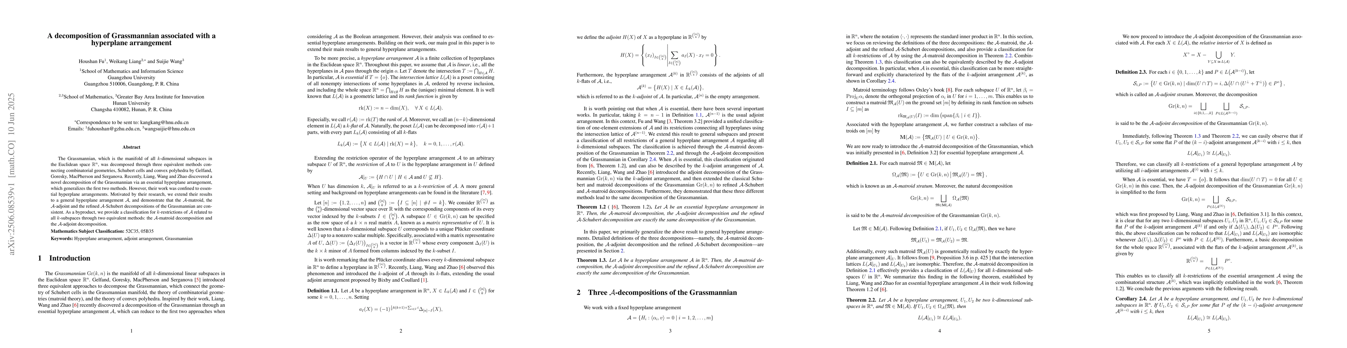The Grassmannian, which is the manifold of all $k$-dimensional subspaces in the Euclidean space $\mathbb{R}^n$, was decomposed through three equivalent methods connecting combinatorial geometries, Schubert cells and convex polyhedra by Gelfand, Goresky, MacPherson and Serganova. Recently, Liang, Wang and Zhao discovered a novel decomposition of the Grassmannian via an essential hyperplane arrangement, which generalizes the first two methods. However, their work was confined to essential hyperplane arrangements. Motivated by their research, we extend their results to a general hyperplane arrangement $\mathcal{A}$, and demonstrate that the $\mathcal{A}$-matroid, the $\mathcal{A}$-adjoint and the refined $\mathcal{A}$-Schubert decompositions of the Grassmannian are consistent. As a byproduct, we provide a classification for $k$-restrictions of $\mathcal{A}$ related to all $k$-subspaces through two equivalent methods: the $\mathcal{A}$-matroid decomposition and the $\mathcal{A}$-adjoint decomposition.