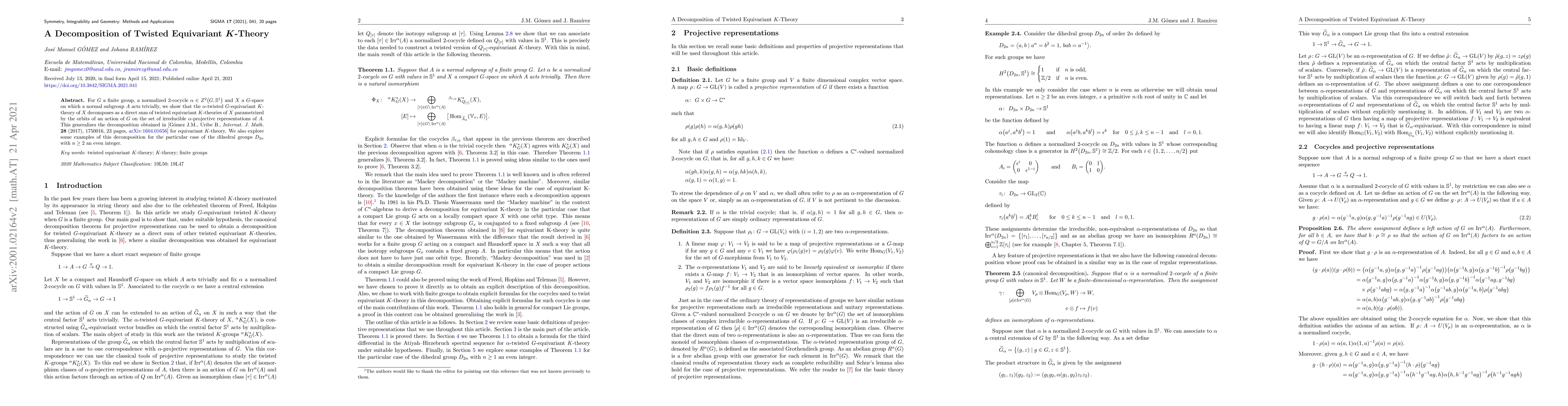 This paper decomposes the $\alpha$-twisted $G$-equivariant $K$-theory of $X$ into a direct sum of twisted equivariant $K$-theories, generalizing a previous result for untwisted theory. Specific examples for dihedral groups $D_{2n}$ are explored.