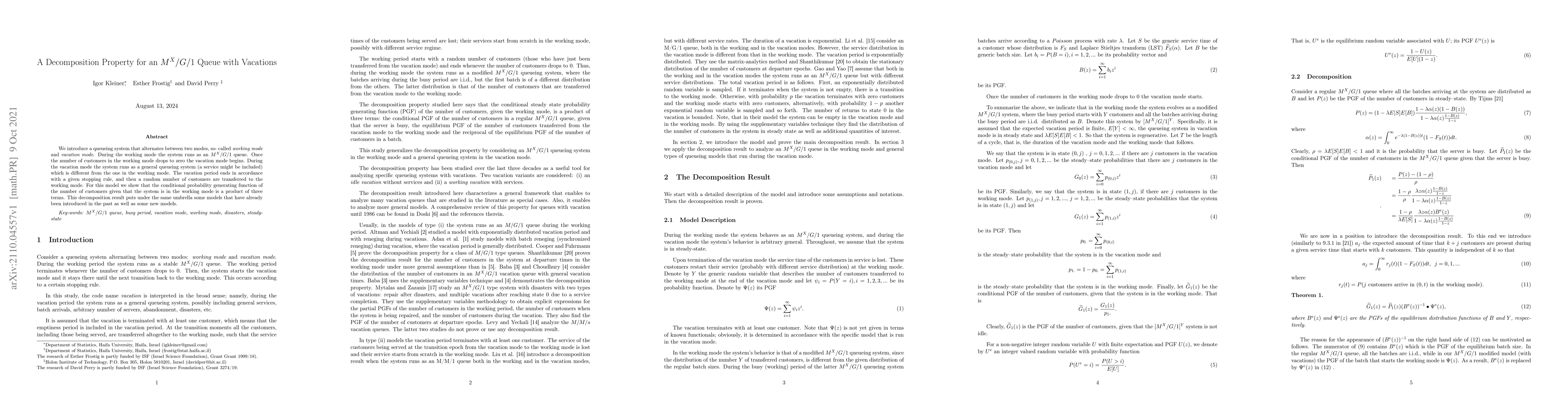 We introduce a queueing system that alternates between two modes, so-called {\it working mode} and {\it vacation mode}. During the working mode the system runs as an $M^{X}/G/1$ queue. Once the number of customers in the working mode drops to zero the vacation mode begins. %Then working system becomes empty the vacation phase begins. During the vacation mode the system runs as a general queueing system (a service might be included) which is different from the one in the working mode. The vacation period ends in accordance with a given stopping rule, and then a random number of customers are transferred to the working mode. For this model we show that the conditional probability generating function of the number of customers given that the system is in the working mode is a product of three terms. This decomposition result puts under the same umbrella some models that have already been introduced in the past as well as some new models.
