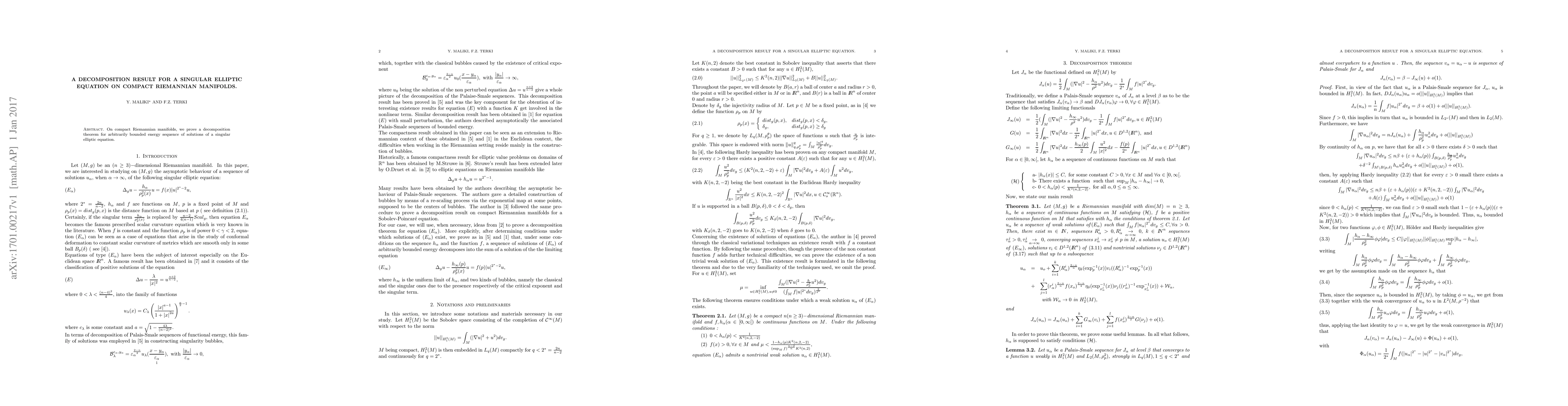 Summary: This paper establishes a decomposition theorem for solutions of a singular elliptic equation on compact Riemannian manifolds, applicable to sequences of solutions with bounded energy. The result provides insight into the structure of such solutions.