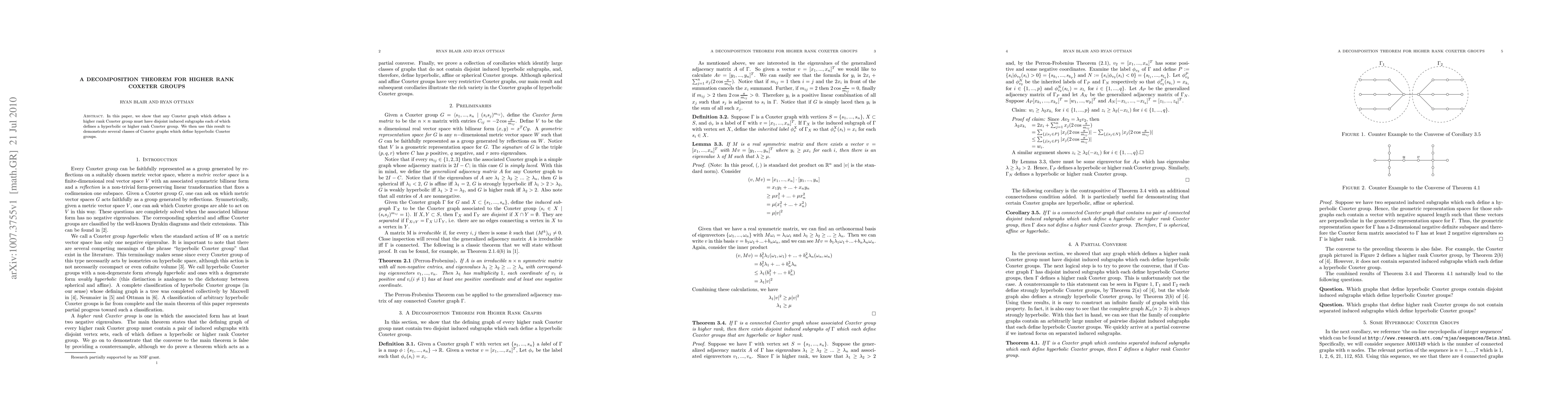 Summary: This paper proves that higher rank Coxeter groups' Coxeter graphs decompose into disjoint subgraphs defining hyperbolic or higher rank Coxeter groups, identifying several classes of such Coxeter graphs.