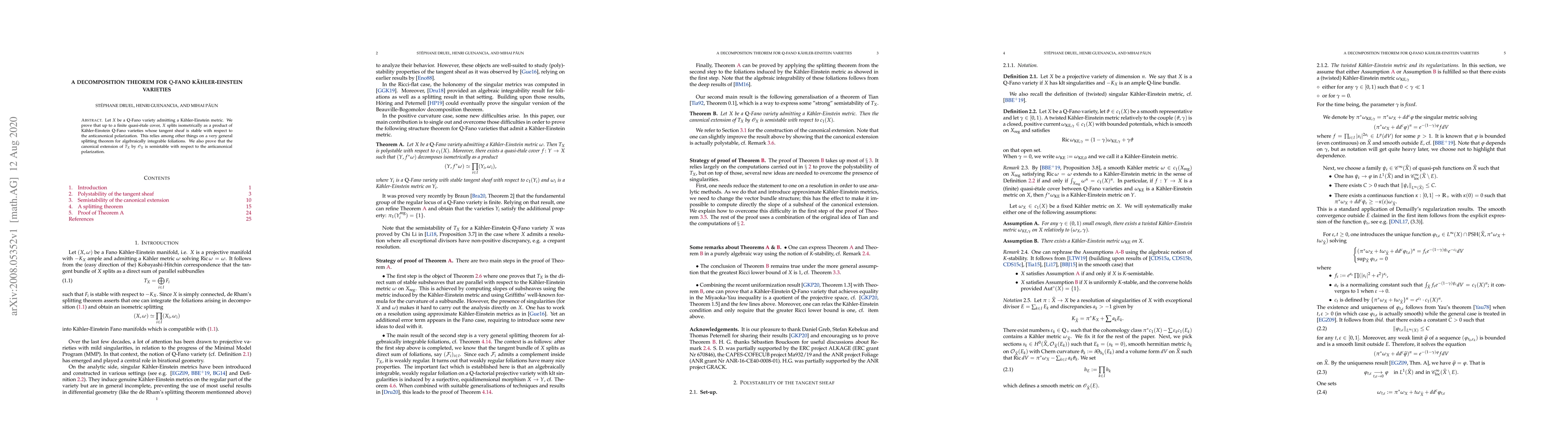 Let $X$ be a $\mathbb Q$-Fano variety admitting a K\"ahler-Einstein metric. We prove that up to a finite quasi-\'etale cover, $X$ splits isometrically as a product of K\"ahler-Einstein $\mathbb Q$-Fano varieties whose tangent sheaf is stable with respect to the anticanonical polarization. This relies among other things on a very general splitting theorem for algebraically integrable foliations. We also prove that the canonical extension of $T_X$ by $\mathscr O_X$ is semistable with respect to the anticanonical polarization.