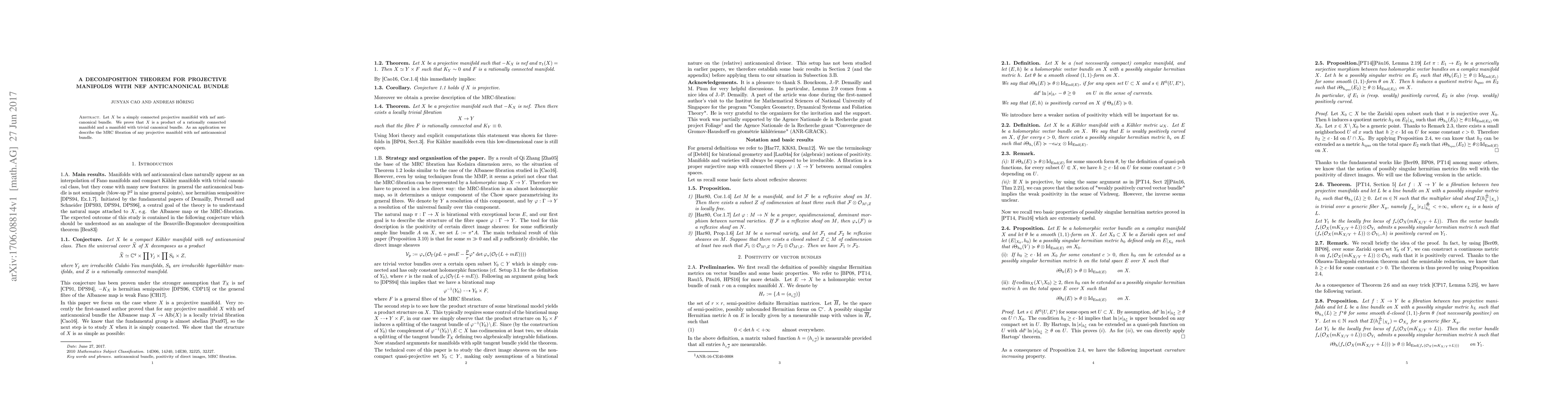 This paper proves a decomposition theorem for simply connected projective manifolds with nef anticanonical bundles, showing they are products of rationally connected manifolds and manifolds with trivial canonical bundles. It also applies this result to describe the MRC fibration for such manifolds.