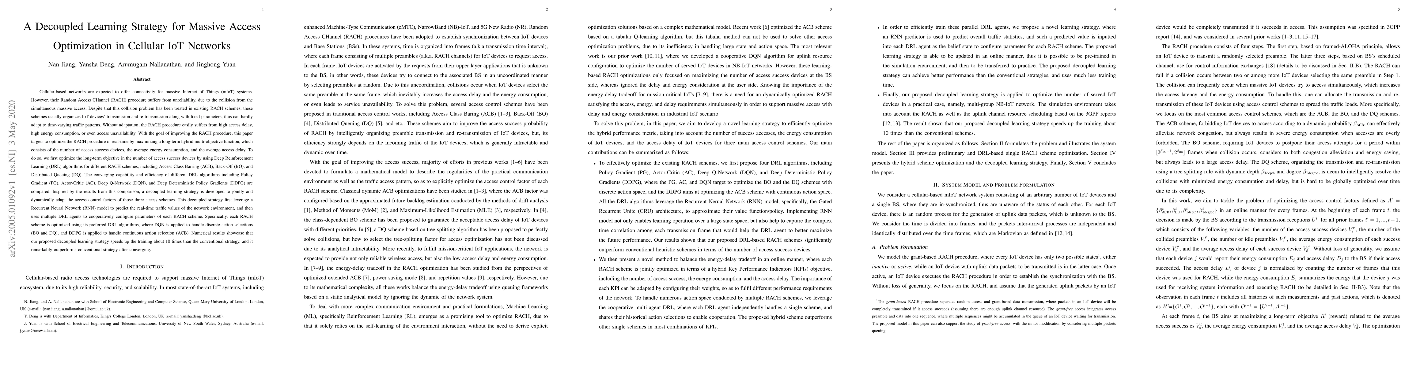 Cellular-based networks are expected to offer connectivity for massive Internet of Things (mIoT) systems. However, their Random Access CHannel (RACH) procedure suffers from unreliability, due to the collision from the simultaneous massive access. Despite that this collision problem has been treated in existing RACH schemes, these schemes usually organize IoT devices' transmission and re-transmission along with fixed parameters, thus can hardly adapt to time-varying traffic patterns. Without adaptation, the RACH procedure easily suffers from high access delay, high energy consumption, or even access unavailability. With the goal of improving the RACH procedure, this paper targets to optimize the RACH procedure in real-time by maximizing a long-term hybrid multi-objective function, which consists of the number of access success devices, the average energy consumption, and the average access delay. To do so, we first optimize the long-term objective in the number of access success devices by using Deep Reinforcement Learning (DRL) algorithms for different RACH schemes, including Access Class Barring (ACB), Back-Off (BO), and Distributed Queuing (DQ). The converging capability and efficiency of different DRL algorithms including Policy Gradient (PG), Actor-Critic (AC), Deep Q-Network (DQN), and Deep Deterministic Policy Gradients (DDPG) are compared. Inspired by the results from this comparison, a decoupled learning strategy is developed to jointly and dynamically adapt the access control factors of those three access schemes. This decoupled strategy first leverage a Recurrent Neural Network (RNN) model to predict the real-time traffic values of the network environment, and then uses multiple DRL agents to cooperatively configure parameters of each RACH scheme.