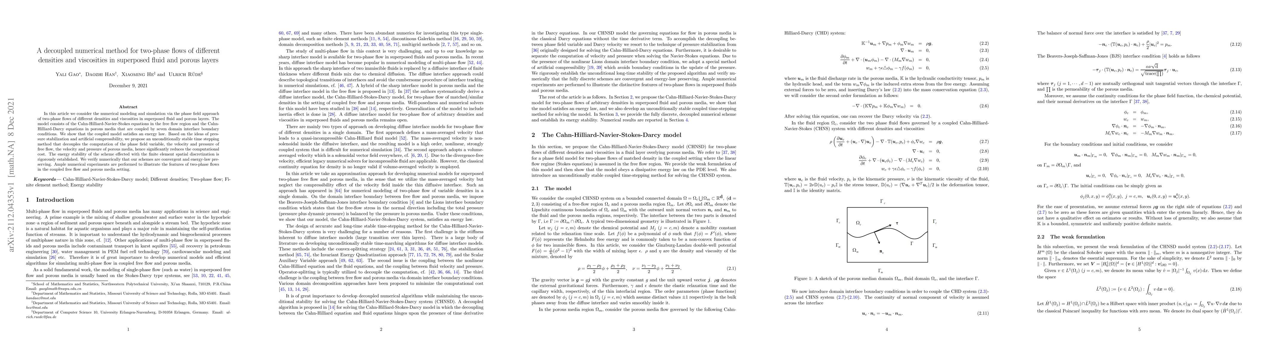 This paper proposes a decoupled numerical method for simulating two-phase flows of different densities and viscosities in superposed fluid and porous layers using a phase field approach. The method stabilizes computations and reduces costs by decoupling the phase field variable, fluid, and porous media velocities and pressures, while maintaining energy stability and convergence.
