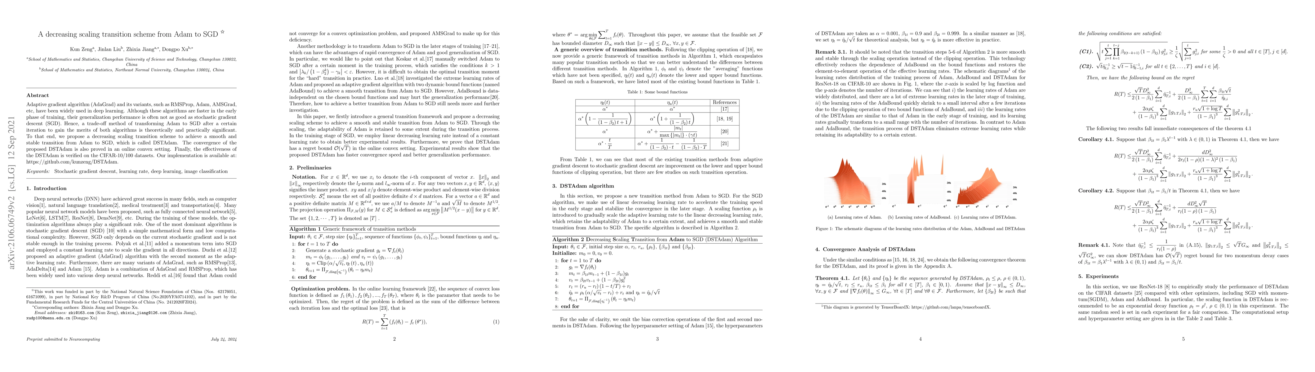 Adaptive gradient algorithm (AdaGrad) and its variants, such as RMSProp, Adam, AMSGrad, etc, have been widely used in deep learning. Although these algorithms are faster in the early phase of training, their generalization performance is often not as good as stochastic gradient descent (SGD). Hence, a trade-off method of transforming Adam to SGD after a certain iteration to gain the merits of both algorithms is theoretically and practically significant. To that end, we propose a decreasing scaling transition scheme to achieve a smooth and stable transition from Adam to SGD, which is called DSTAdam. The convergence of the proposed DSTAdam is also proved in an online convex setting. Finally, the effectiveness of the DSTAdam is verified on the CIFAR-10/100 datasets. Our implementation is available at: https://github.com/kunzeng/DSTAdam.