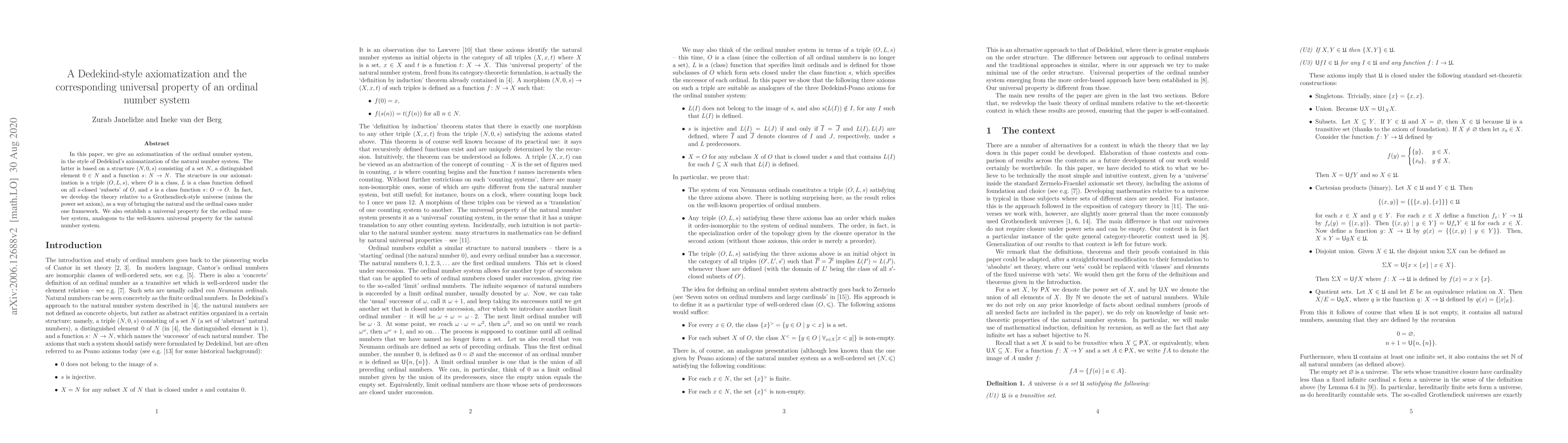 This paper provides a new axiomatization for the ordinal number system in a style similar to Dedekind's natural number system, establishing a universal property that brings together both systems under one framework.