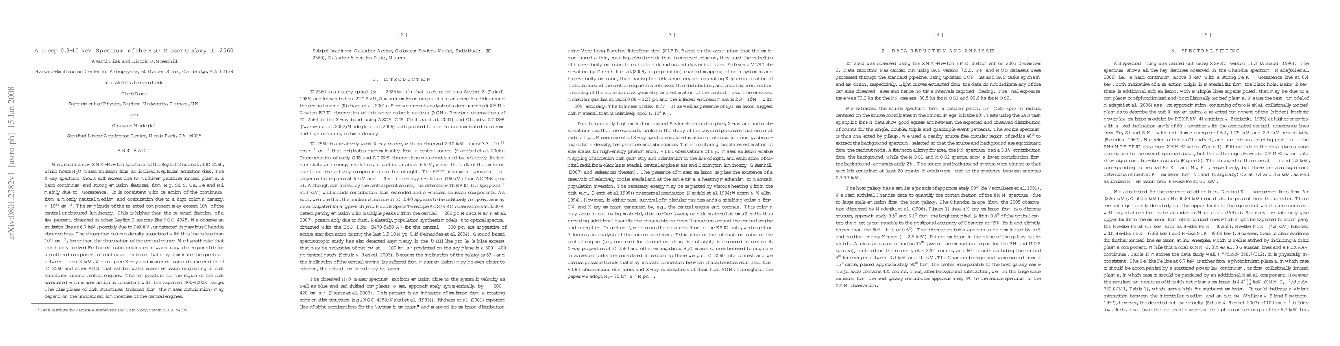 We present a new XMM-Newton spectrum of the Seyfert 2 nucleus of IC 2560, which hosts H$_{2}$O maser emission from an inclined Keplerian accretion disk. The X-ray spectrum shows soft excess due to multi-temperature ionized plasma, a hard continuum and strong emission features, from Mg, Si, S, Ca, Fe and Ni, mainly due to fluorescence. It is consistent with reflection of the continuum from a mostly neutral medium and obscuration due to a high column density, $>$ 10$^{24}$ cm$^{-2}$. The amplitude of the reflected component may exceed 10% of the central unobscured luminosity. This is higher than the reflected fraction, of a few percent, observed in other Seyfert 2 sources like NGC 4945. We observe an emission line at 6.7 keV, possibly due to FeXXV, undetected in previous Chandra observations. The absorption column density associated with this line is less than 10$^{23}$ cm$^{-2}$, lower than the obscuration of the central source. We hypothesize that this highly ionized Fe line emission originates in warm gas, also responsible for a scattered component of continuum emission that may dominate the spectrum between 1 and 3 keV. We compare X-ray and maser emission characteristics of IC 2560 and other AGN that exhibit water maser emission originating in disk structures around central engines. The temperature for the region of the disk associated with maser action is consistent with the expected 400-1000K range. The clumpiness of disk structures (inferred from the maser distribution) may depend on the unobscured luminosities of the central engines.