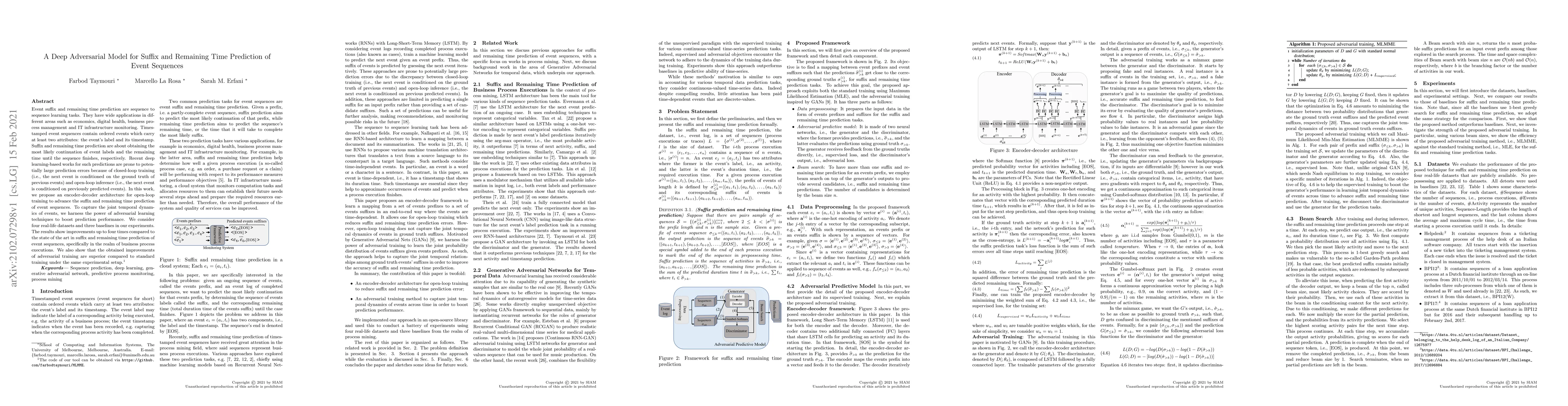 This paper proposes a deep adversarial model for improving suffix and remaining time prediction in event sequences, addressing errors from closed-loop training and open-loop inference. The model uses adversarial learning to enhance prediction performance, achieving up to four times better results compared to state-of-the-art methods on business process execution datasets.