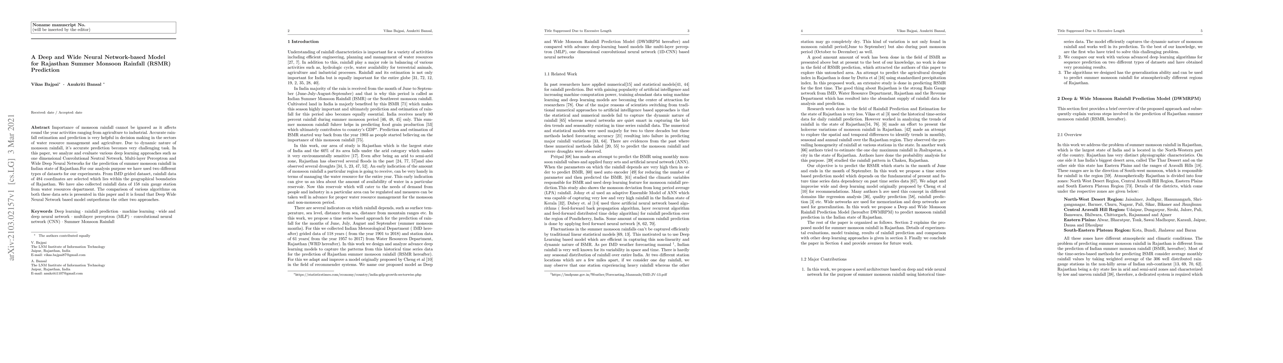 This paper evaluates deep learning models, including Convolutional Neural Networks, Multi-layer Perceptrons, and Wide Deep Neural Networks, for predicting Rajasthan Summer Monsoon Rainfall (RSMR). Results show that the Deep Wide Neural Network model outperforms others, demonstrating its effectiveness in handling the complex dynamics of monsoon rainfall prediction.