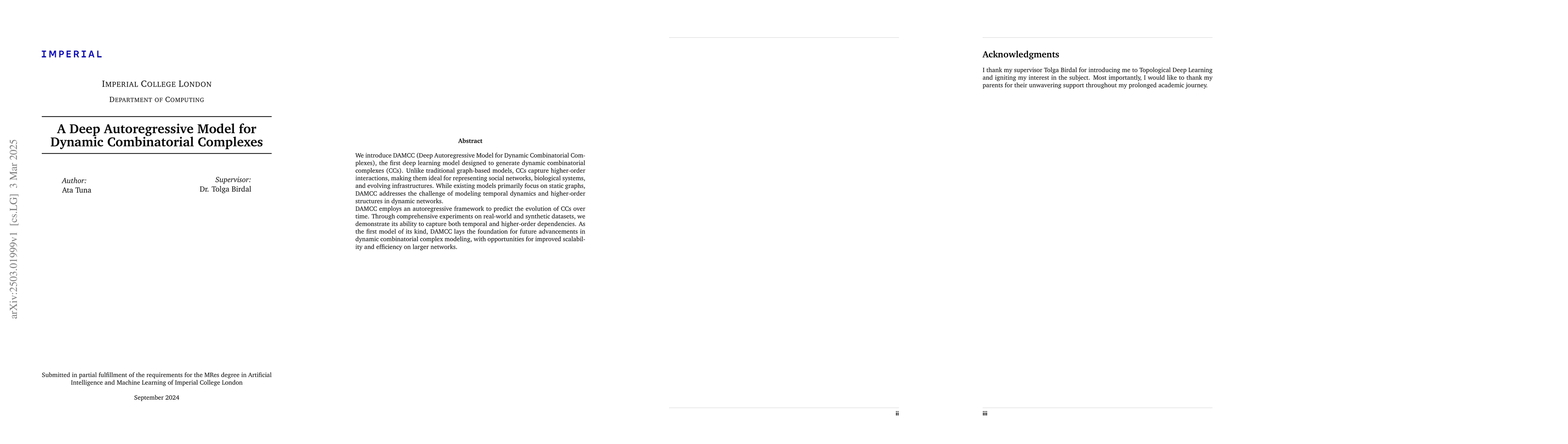 We introduce DAMCC (Deep Autoregressive Model for Dynamic Combinatorial Complexes), the first deep learning model designed to generate dynamic combinatorial complexes (CCs). Unlike traditional graph-based models, CCs capture higher-order interactions, making them ideal for representing social networks, biological systems, and evolving infrastructures. While existing models primarily focus on static graphs, DAMCC addresses the challenge of modeling temporal dynamics and higher-order structures in dynamic networks. DAMCC employs an autoregressive framework to predict the evolution of CCs over time. Through comprehensive experiments on real-world and synthetic datasets, we demonstrate its ability to capture both temporal and higher-order dependencies. As the first model of its kind, DAMCC lays the foundation for future advancements in dynamic combinatorial complex modeling, with opportunities for improved scalability and efficiency on larger networks.