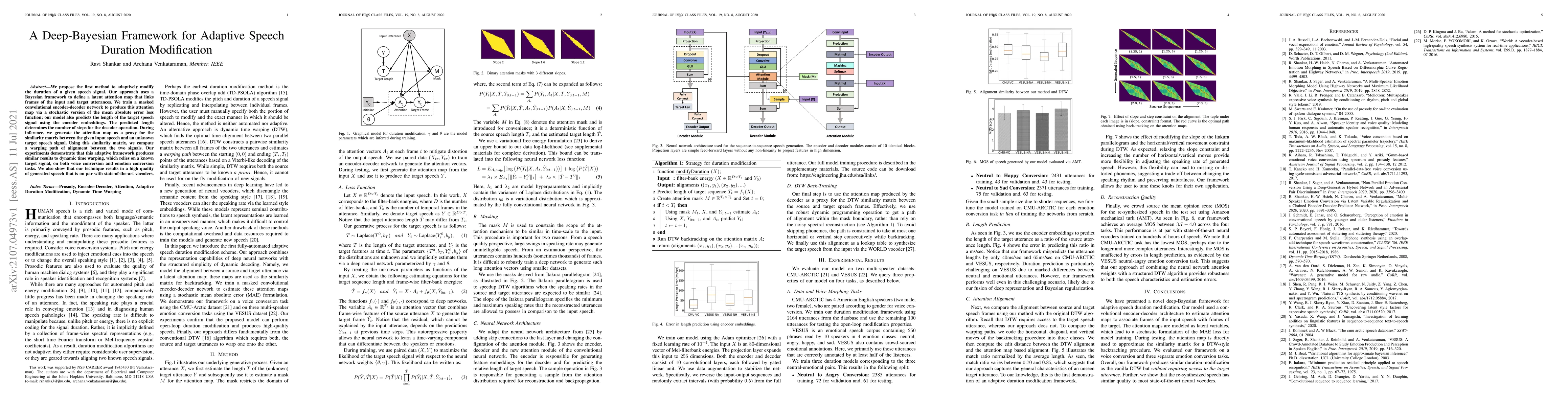 We propose the first method to adaptively modify the duration of a given speech signal. Our approach uses a Bayesian framework to define a latent attention map that links frames of the input and target utterances. We train a masked convolutional encoder-decoder network to produce this attention map via a stochastic version of the mean absolute error loss function; our model also predicts the length of the target speech signal using the encoder embeddings. The predicted length determines the number of steps for the decoder operation. During inference, we generate the attention map as a proxy for the similarity matrix between the given input speech and an unknown target speech signal. Using this similarity matrix, we compute a warping path of alignment between the two signals. Our experiments demonstrate that this adaptive framework produces similar results to dynamic time warping, which relies on a known target signal, on both voice conversion and emotion conversion tasks. We also show that our technique results in a high quality of generated speech that is on par with state-of-the-art vocoders.