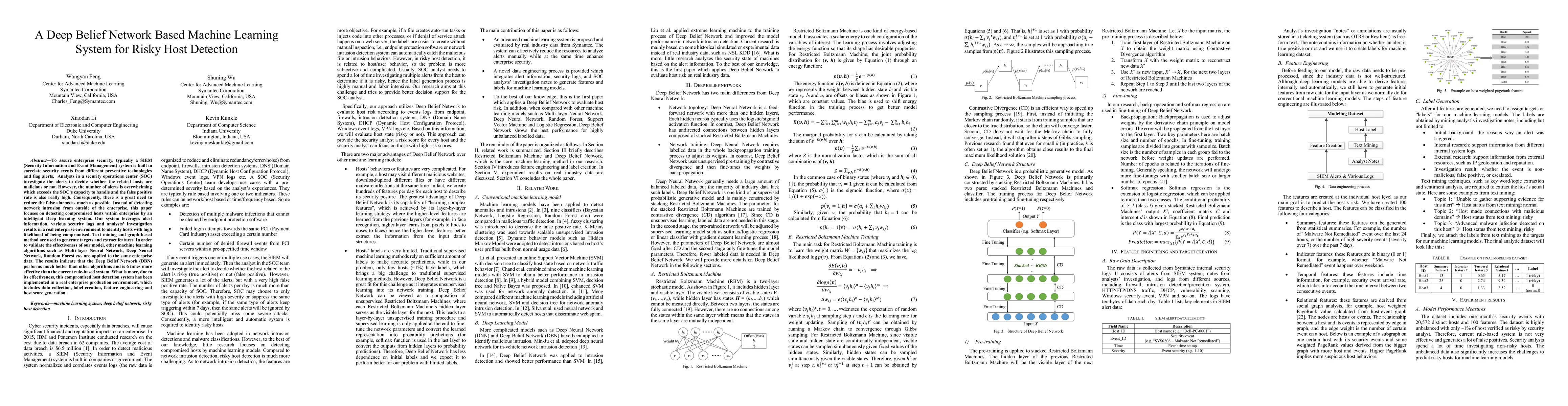 This research introduces a Deep Belief Network (DBN) machine learning system to reduce false positives in cybersecurity alerts, focusing on risk detection rather than network intrusion. The DBN outperforms other algorithms like multi-layer neural networks, random forests, SVMs, and logistic regression in a real enterprise environment. The system, implemented for data collection, label creation, feature engineering, and host scoring, is six times more effective than the existing rule-based system.