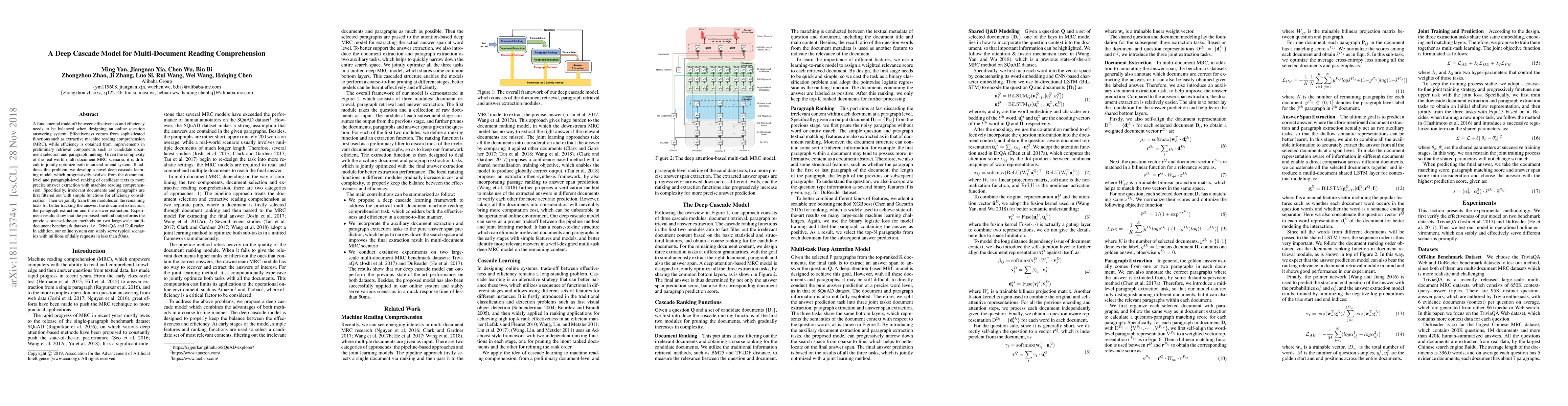 The paper proposes a deep cascade model for multi-document reading comprehension that balances effectiveness and efficiency by progressively filtering irrelevant documents and paragraphs, followed by joint training of extraction modules for precise answer extraction. The model outperforms previous methods on benchmark datasets and can handle millions of daily requests efficiently.