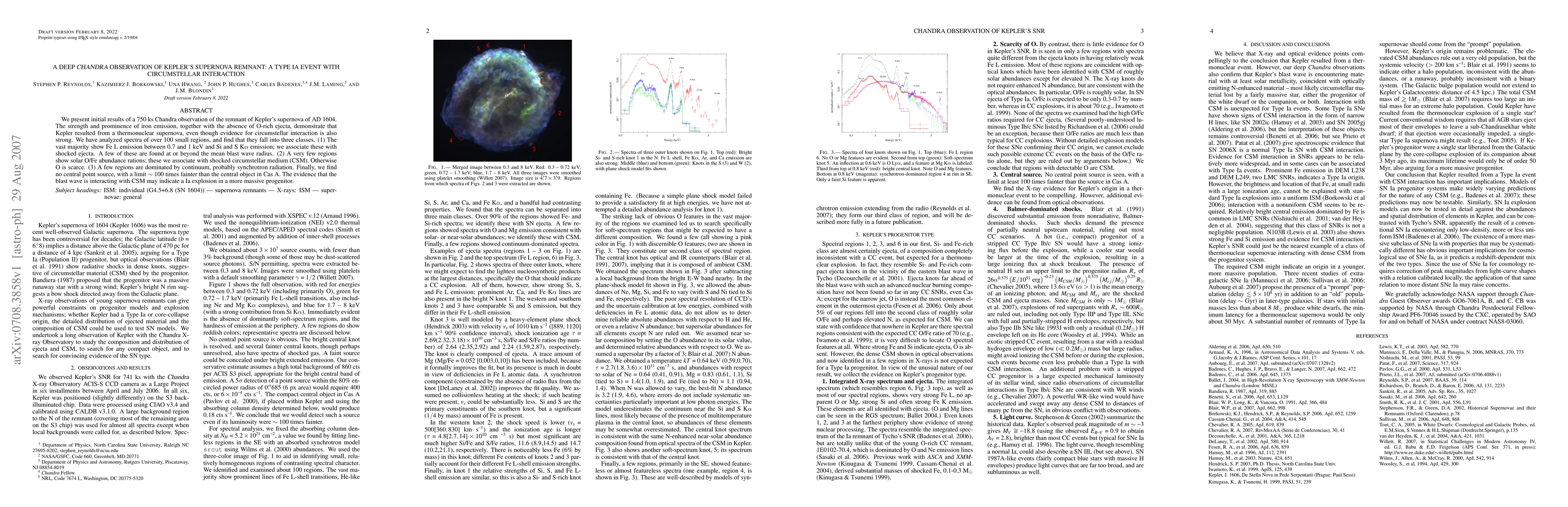 We present initial results of a 750 ks Chandra observation of the remnant of Kepler's supernova of AD 1604. The strength and prominence of iron emission, together with the absence of O-rich ejecta, demonstrate that Kepler resulted from a thermonuclear supernova, even though evidence for circumstellar interaction is also strong. We have analyzed spectra of over 100 small regions, and find that they fall into three classes. (1) The vast majority show Fe L emission between 0.7 and 1 keV and Si and S K alpha emission; we associate these with shocked ejecta. A few of these are found at or beyond the mean blast wave radius. (2) A very few regions show solar O/Fe abundance rations; these we associate with shocked circumstellar medium (CSM). Otherwise O is scarce. (3) A few regions are dominated by continuum, probably synchrotron radiation. Finally, we find no central point source, with a limit about 100 times fainter than the central object in Cas A. The evidence that the blast wave is interacting with CSM may indicate a Ia explosion in a more massive progenitor.