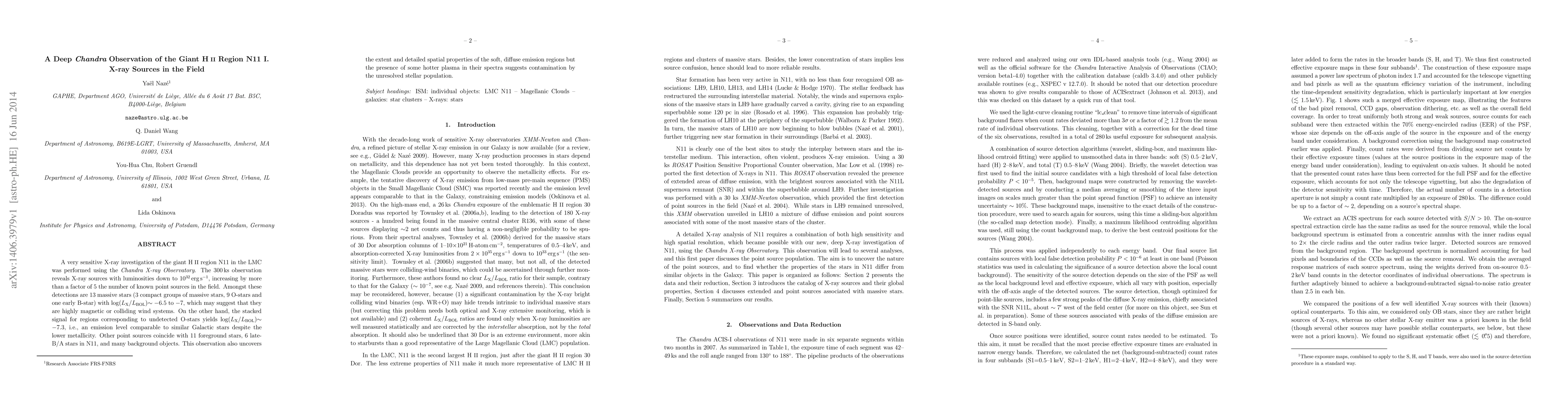A Chandra X-ray Observatory study of the giant HII region N11 in the LMC reveals 13 massive stars with high luminosities, while also detecting many background objects, providing new insights into the region's structure and composition.