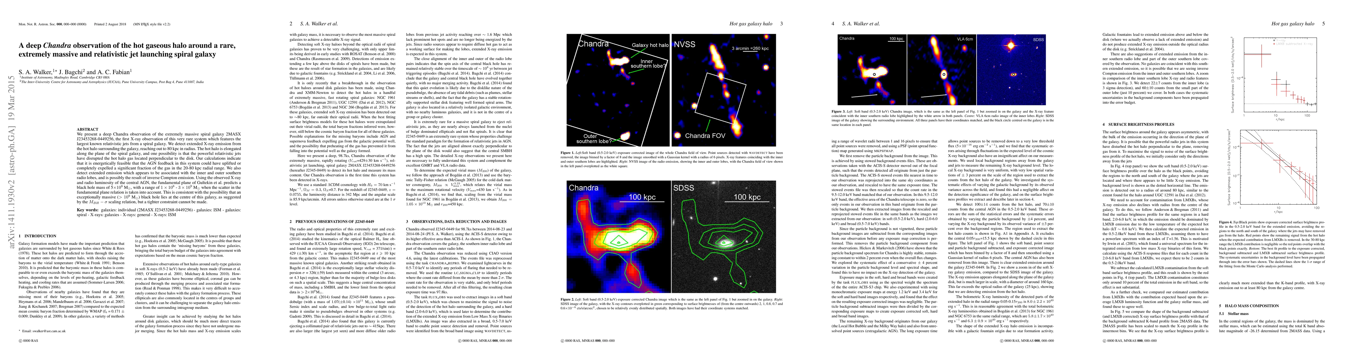 We present a deep Chandra observation of the extremely massive spiral galaxy 2MASX J23453268-0449256, the first X-ray observation of this very rare system which features the largest known relativistic jets from a spiral galaxy. We detect extended X-ray emission from the hot halo surrounding the galaxy, reaching out to 80 kpc in radius. The hot halo is elongated along the plane of the spiral galaxy, and one possibility is that the powerful relativistic jets have disrupted the hot halo gas located perpendicular to the disk. Our calculations indicate that it is energetically feasible that the AGN feedback in this system could have uplifted or completely expelled a significant fraction of the gas in the 20-80 kpc radial range. We also detect extended emission which appears to be associated with the inner and outer southern radio lobes, and is possibly the result of inverse Compton emission. Using the observed X-ray and radio luminosity of the central AGN, the fundamental plane of Gultekin et al. predicts a black hole mass of 5x10^8 M_solar, with a range of 1x10^8 - 3x10^9 M_solar when the scatter in the fundamental plane relation is taken into account. This is consistent with the possibility that an exceptionally massive (>10^9 M_solar) black hole lies at the centre of this galaxy, as suggested by the M_BH-sigma scaling relation, but a tighter constraint cannot be made.