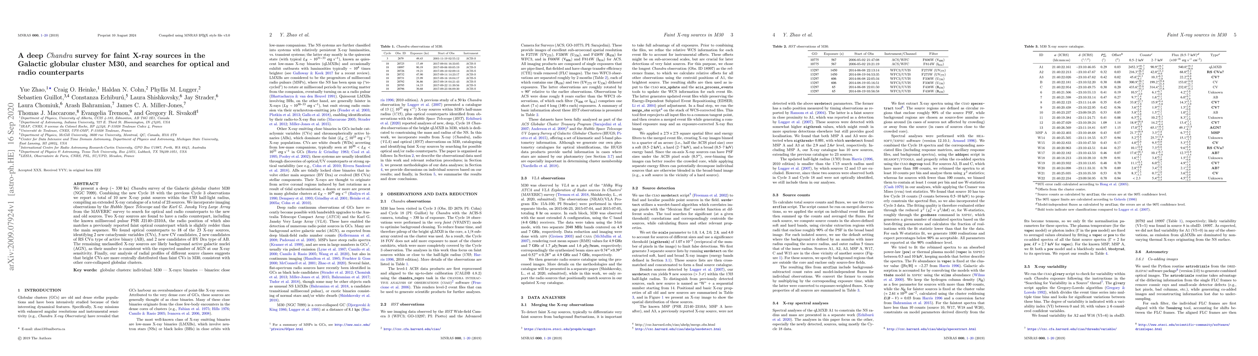 This paper reports a deep Chandra X-ray survey of the globular cluster M30, identifying 10 new X-ray sources and compiling a total of 23 sources. Optical and radio counterparts were found for 18 of these, including new cataclysmic variables and active binaries, while the remaining sources likely represent background active galactic nuclei.