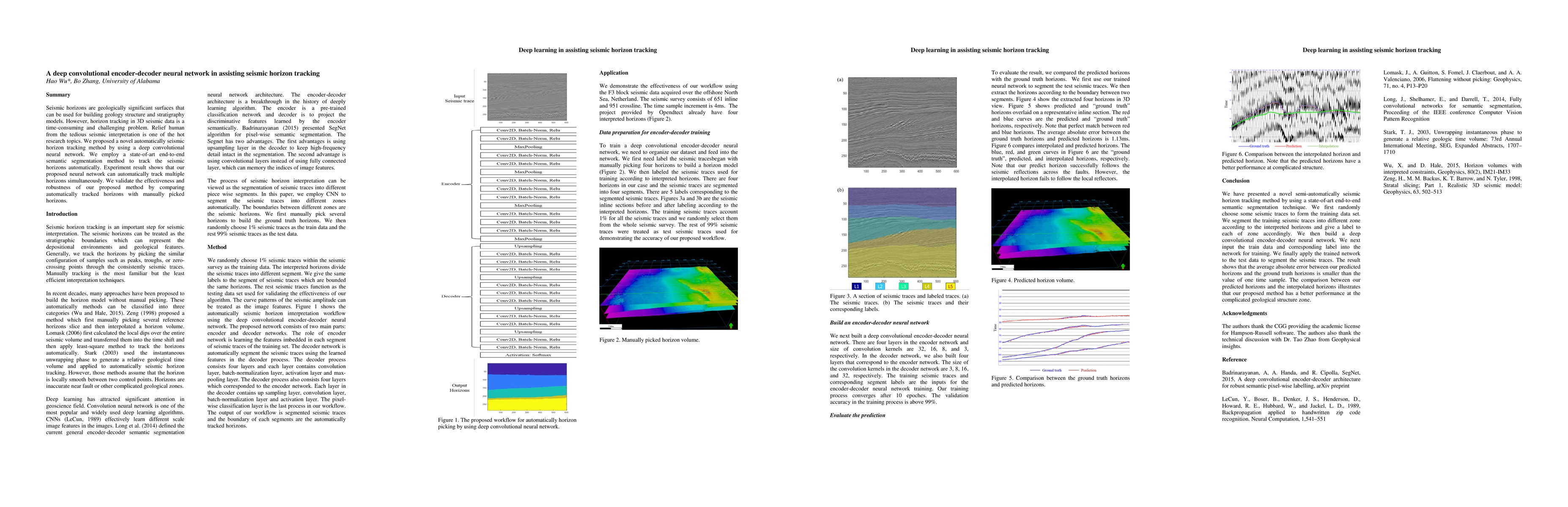 This paper proposes a deep convolutional encoder-decoder neural network for automatic seismic horizon tracking in 3D seismic data, using a state-of-the-art end-to-end semantic segmentation method. Experimental results demonstrate the method's effectiveness and robustness in simultaneously tracking multiple horizons compared to manually picked horizons.