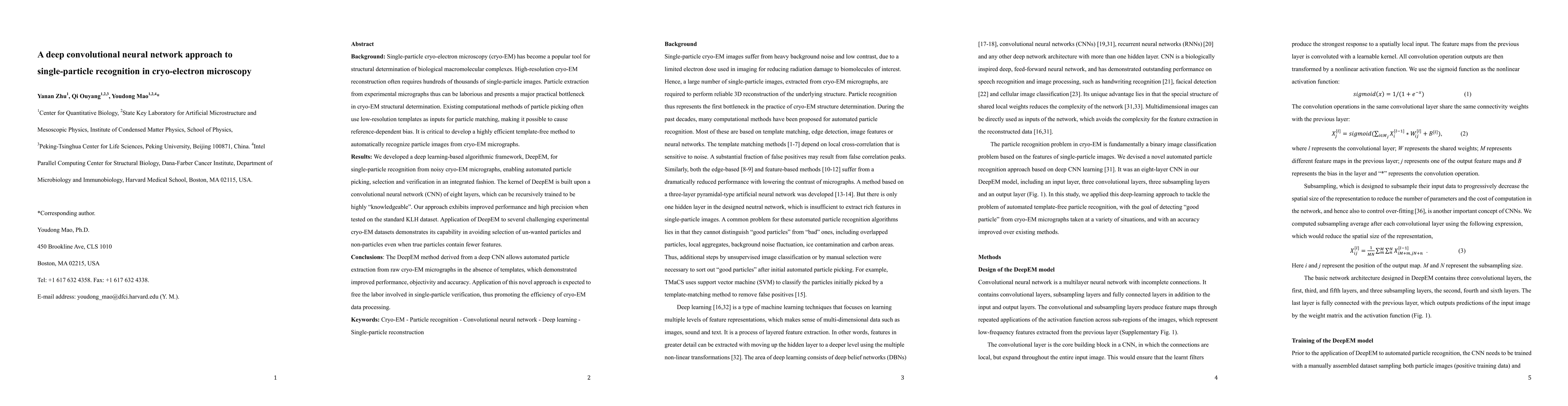 This paper introduces DeepEM, a deep convolutional neural network (CNN) framework for automated single-particle recognition in cryo-electron microscopy (cryo-EM). The method, which does not rely on templates, shows improved performance and precision in particle picking, selection, and verification, thus enhancing the efficiency of cryo-EM data processing.