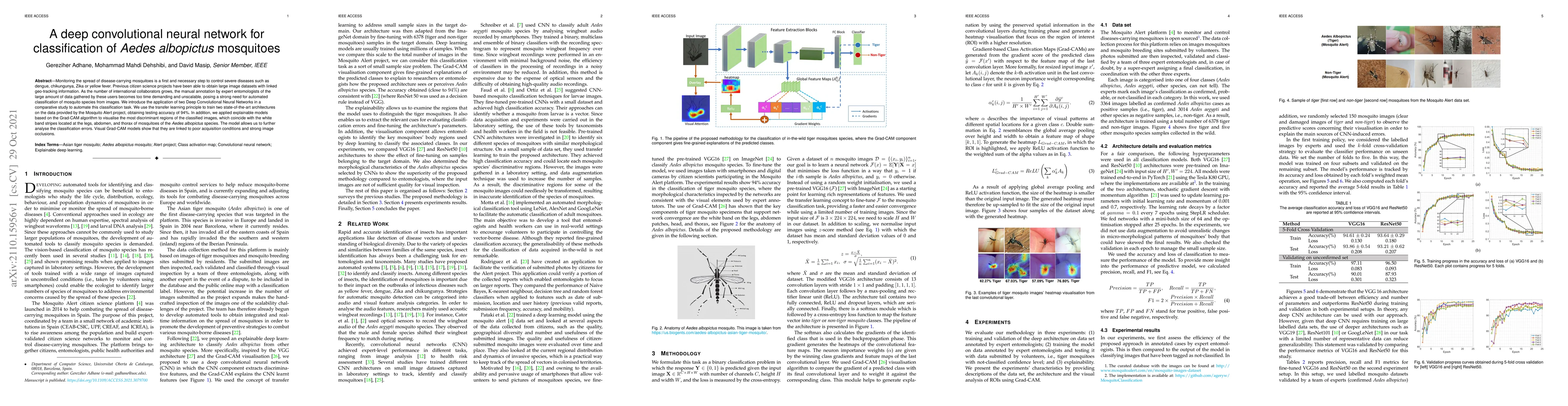 This paper presents a deep convolutional neural network for automating the classification of Aedes albopictus mosquitoes from images, achieving 94% accuracy. The study employs transfer learning on data from the Mosquito Alert project and uses Grad-CAM for visual analysis of classification decisions, highlighting key features like leg stripes for error detection.