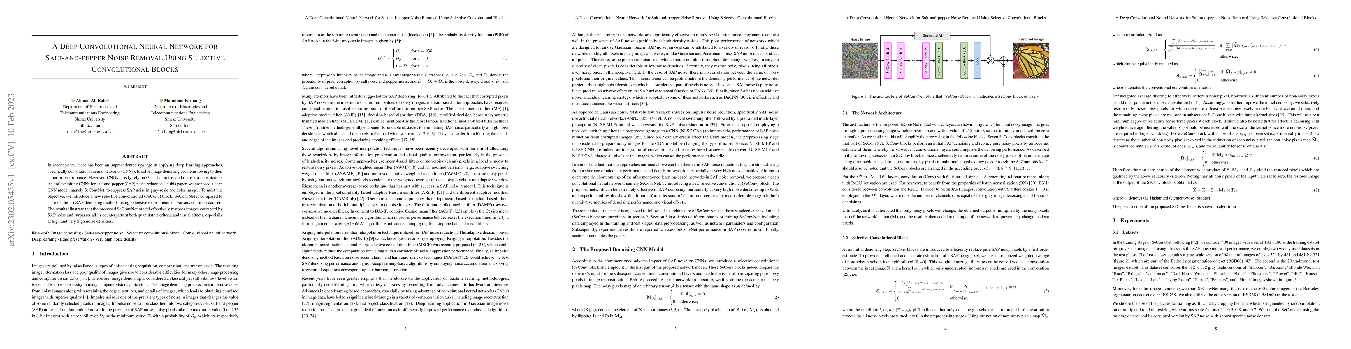 This paper proposes SeConvNet, a deep convolutional neural network with selective convolutional blocks, to effectively remove salt-and-pepper noise from images. Experimental results show that SeConvNet outperforms existing methods in both quantitative metrics and visual quality, especially at high noise densities.