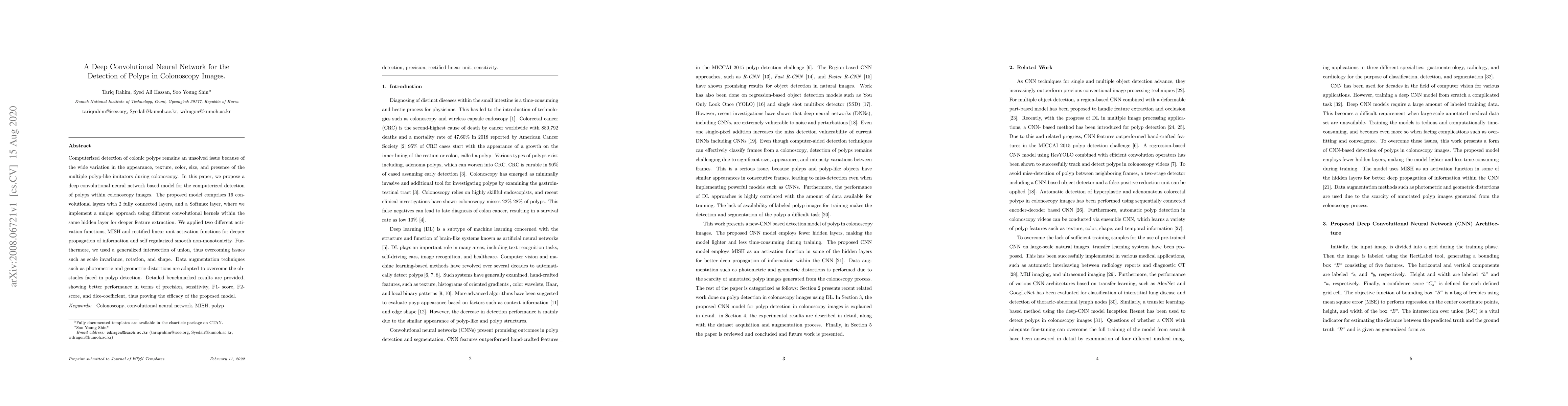 A deep convolutional neural network was proposed to detect polyps in colonoscopy images with improved performance on precision, sensitivity, F1-score, and dice-coefficient measures.