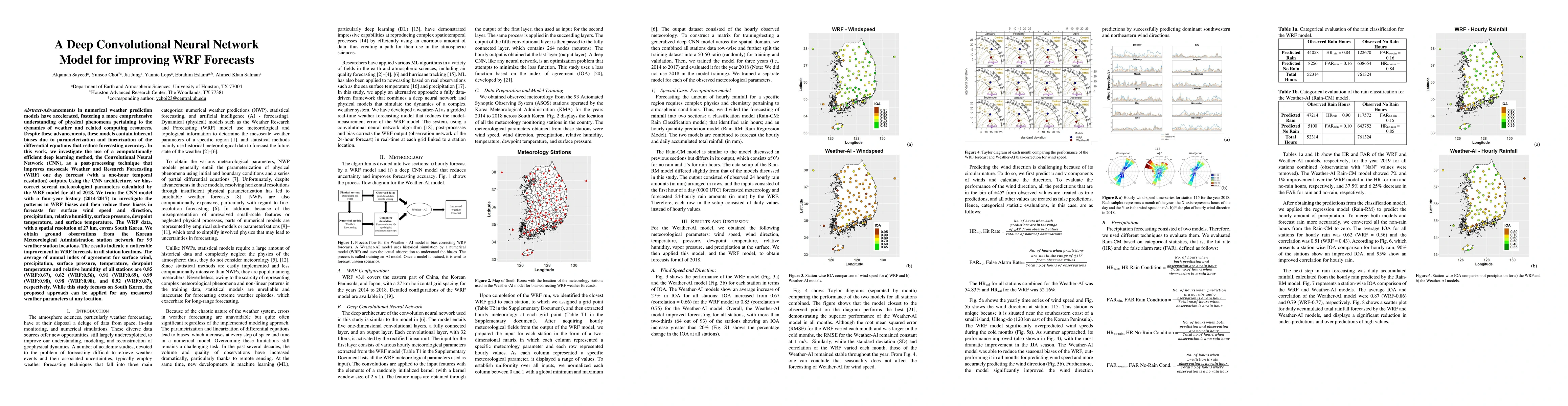 Advancements in numerical weather prediction models have accelerated, fostering a more comprehensive understanding of physical phenomena pertaining to the dynamics of weather and related computing resources. Despite these advancements, these models contain inherent biases due to parameterization and linearization of the differential equations that reduce forecasting accuracy. In this work, we investigate the use of a computationally efficient deep learning method, the Convolutional Neural Network (CNN), as a post-processing technique that improves mesoscale Weather and Research Forecasting (WRF) one day forecast (with a one-hour temporal resolution) outputs. Using the CNN architecture, we bias-correct several meteorological parameters calculated by the WRF model for all of 2018. We train the CNN model with a four-year history (2014-2017) to investigate the patterns in WRF biases and then reduce these biases in forecasts for surface wind speed and direction, precipitation, relative humidity, surface pressure, dewpoint temperature, and surface temperature. The WRF data, with a spatial resolution of 27 km, covers South Korea. We obtain ground observations from the Korean Meteorological Administration station network for 93 weather station locations. The results indicate a noticeable improvement in WRF forecasts in all station locations. The average of annual index of agreement for surface wind, precipitation, surface pressure, temperature, dewpoint temperature and relative humidity of all stations are 0.85 (WRF:0.67), 0.62 (WRF:0.56), 0.91 (WRF:0.69), 0.99 (WRF:0.98), 0.98 (WRF:0.98), and 0.92 (WRF:0.87), respectively. While this study focuses on South Korea, the proposed approach can be applied for any measured weather parameters at any location.