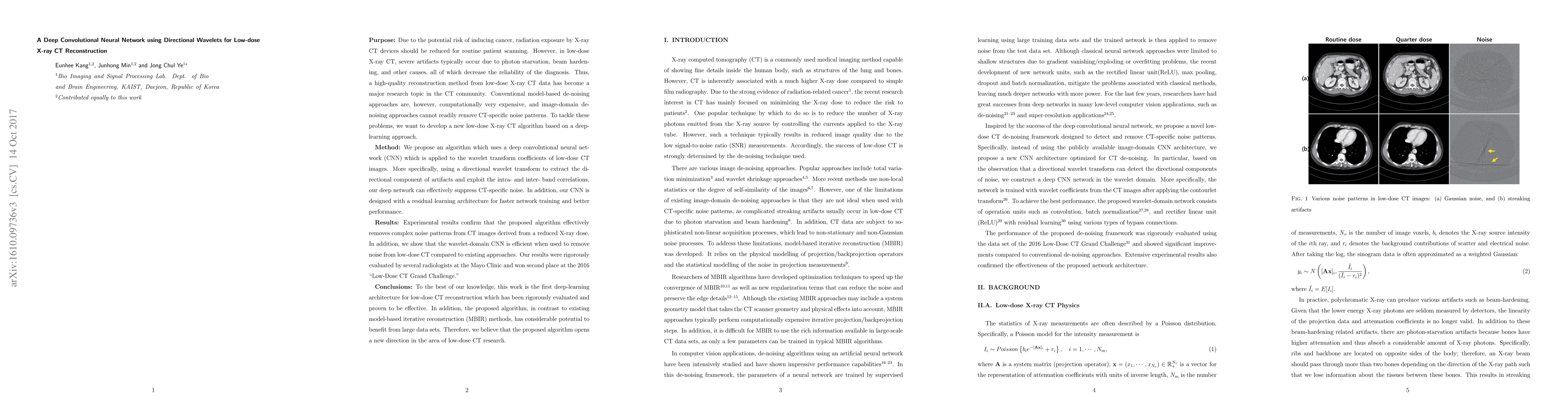 This paper proposes a deep convolutional neural network (CNN) using directional wavelets to reconstruct high-quality images from low-dose X-ray CT scans, effectively suppressing CT-specific noise patterns and outperforming conventional denoising methods. The wavelet domain CNN, with its residual learning architecture, was rigorously evaluated and won second place in the 2016 AAPM Low-Dose CT Grand Challenge.