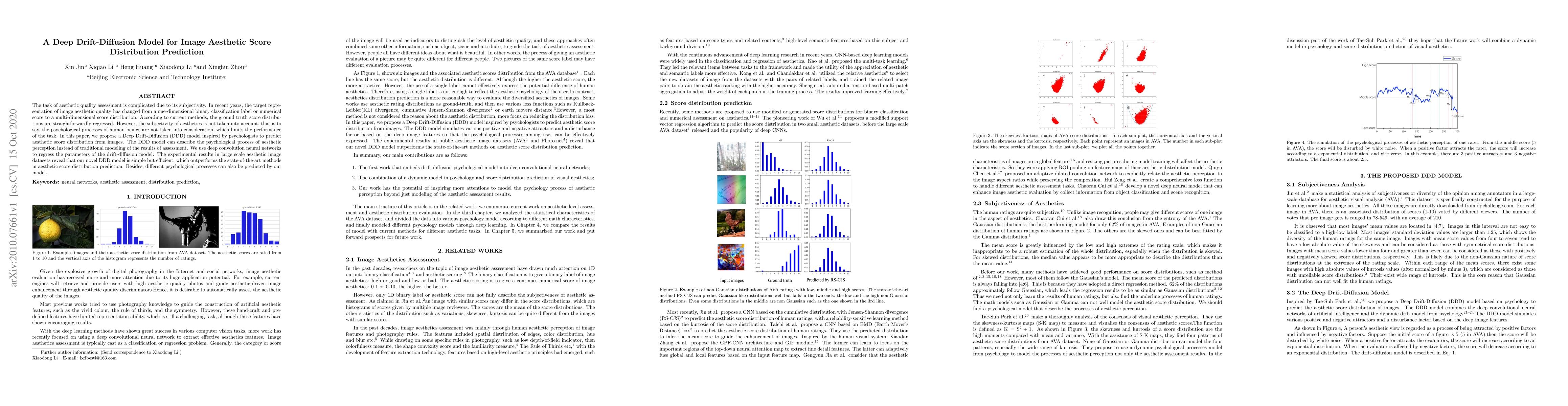 This paper proposes a Deep Drift-Diffusion (DDD) model to predict image aesthetic score distributions, inspired by psychological processes of aesthetic perception. It outperforms existing methods by considering the subjective nature of aesthetics and using deep convolution neural networks to regress model parameters.
