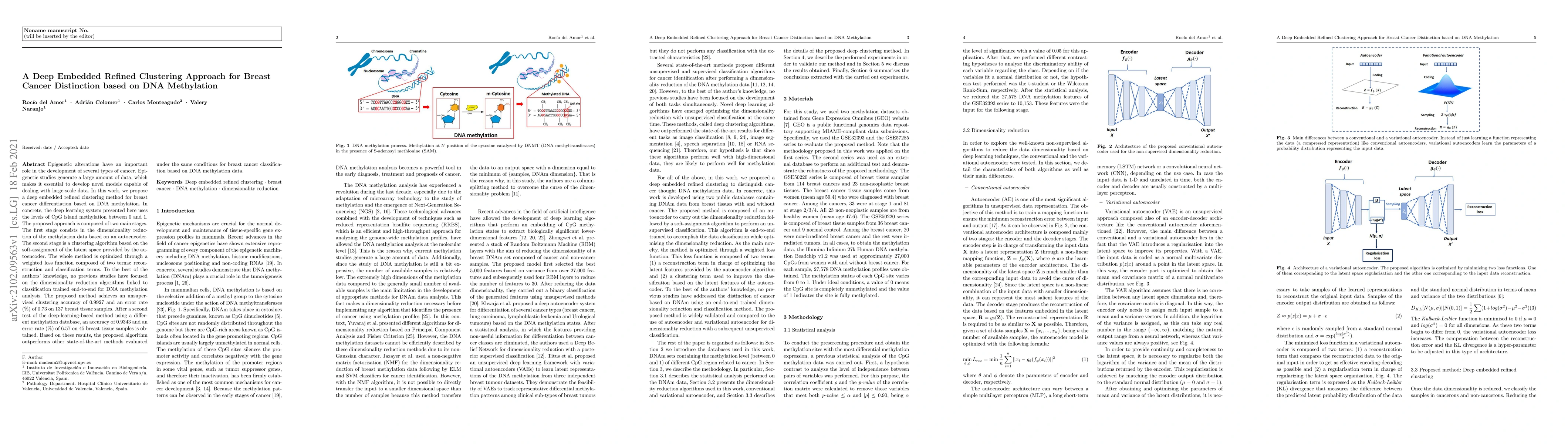 Epigenetic alterations have an important role in the development of several types of cancer. Epigenetic studies generate a large amount of data, which makes it essential to develop novel models capable of dealing with large-scale data. In this work, we propose a deep embedded refined clustering method for breast cancer differentiation based on DNA methylation. In concrete, the deep learning system presented here uses the levels of CpG island methylation between 0 and 1. The proposed approach is composed of two main stages. The first stage consists in the dimensionality reduction of the methylation data based on an autoencoder. The second stage is a clustering algorithm based on the soft-assignment of the latent space provided by the autoencoder. The whole method is optimized through a weighted loss function composed of two terms: reconstruction and classification terms. To the best of the authors' knowledge, no previous studies have focused on the dimensionality reduction algorithms linked to classification trained end-to-end for DNA methylation analysis. The proposed method achieves an unsupervised clustering accuracy of 0.9927 and an error rate (%) of 0.73 on 137 breast tissue samples. After a second test of the deep-learning-based method using a different methylation database, an accuracy of 0.9343 and an error rate (%) of 6.57 on 45 breast tissue samples is obtained. Based on these results, the proposed algorithm outperforms other state-of-the-art methods evaluated under the same conditions for breast cancer classification based on DNA methylation data.