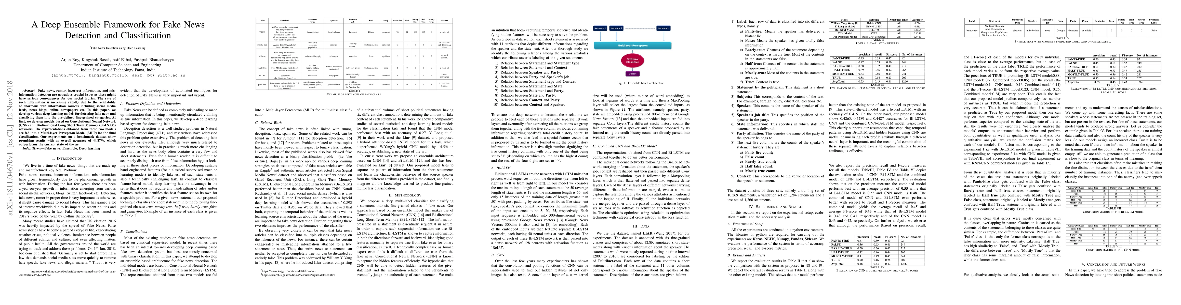 The paper proposes a deep ensemble framework using CNN and Bi-LSTM models followed by an MLP for detecting and classifying fake news, achieving an overall accuracy of 44.87% and outperforming current state-of-the-art methods.