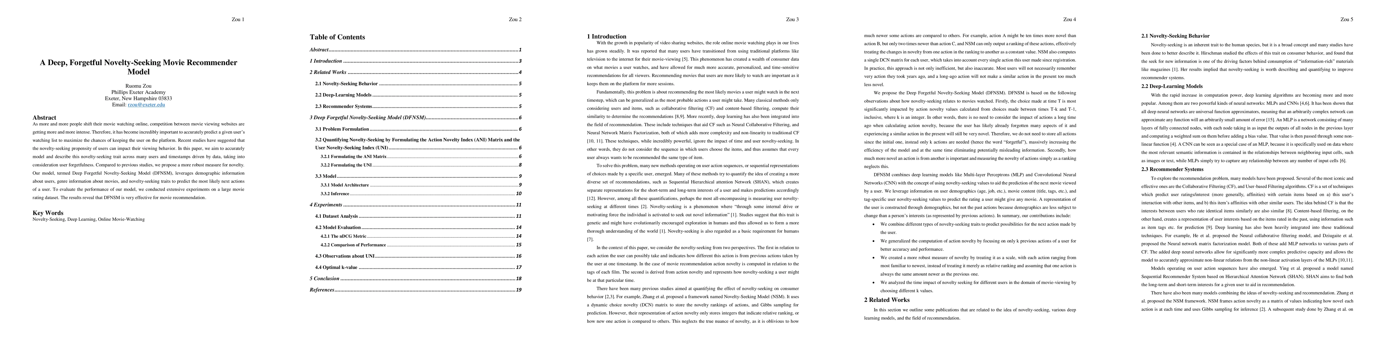 This paper introduces a Deep Forgetful Novelty-Seeking Model (DFNSM) to predict users' next movie-watching actions by considering their novelty-seeking traits and user forgetfulness. The model outperforms previous methods in recommending movies by leveraging demographic and genre data.