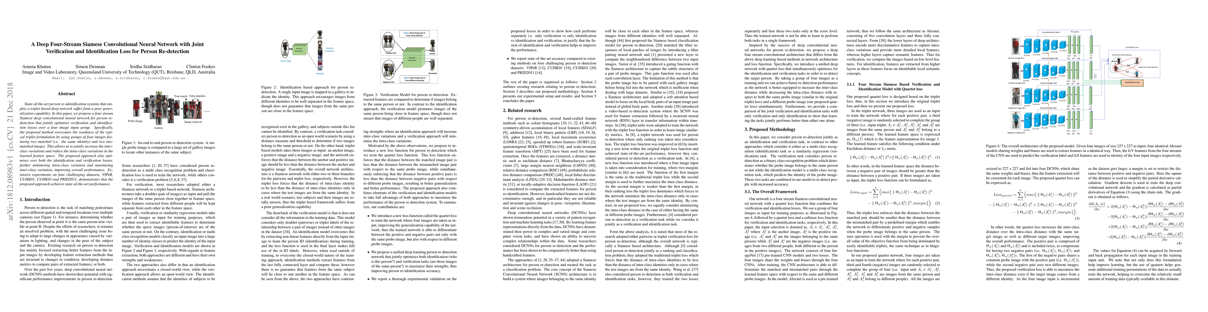 This paper proposes a four-stream Siamese CNN with joint verification and identification loss for person re-detection, addressing the limitations of triplet-based networks by using four image groups to enhance feature differentiation. The method achieves state-of-the-art results on four datasets by optimizing interclass and intraclass variations.