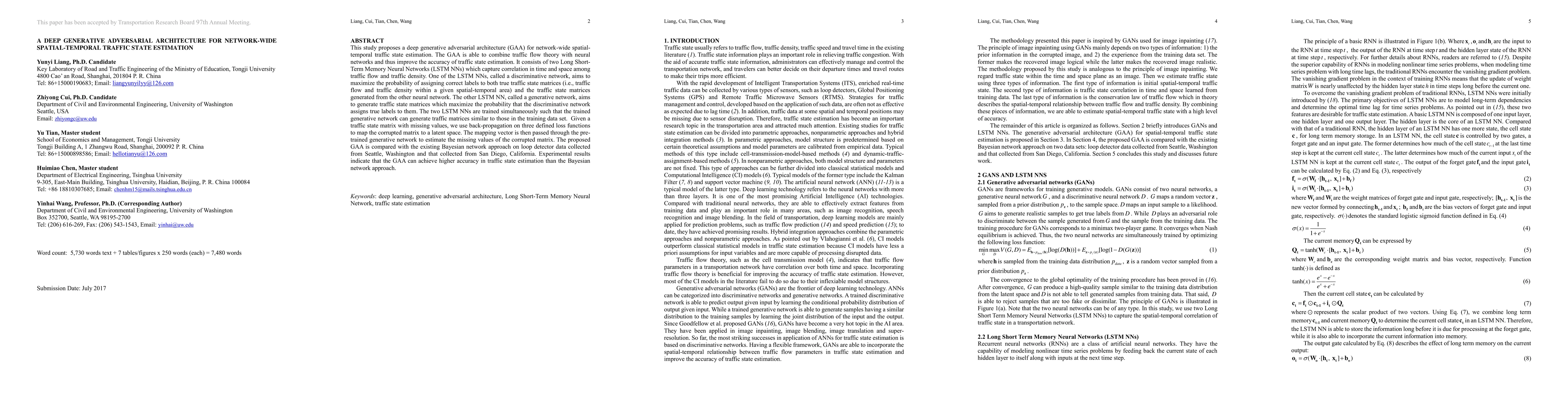 This paper proposes a deep generative adversarial architecture (GAA) for improving network-wide spatial-temporal traffic state estimation using LSTM NNs, showing higher accuracy compared to a Bayesian network approach through experiments on data from Seattle and San Diego.