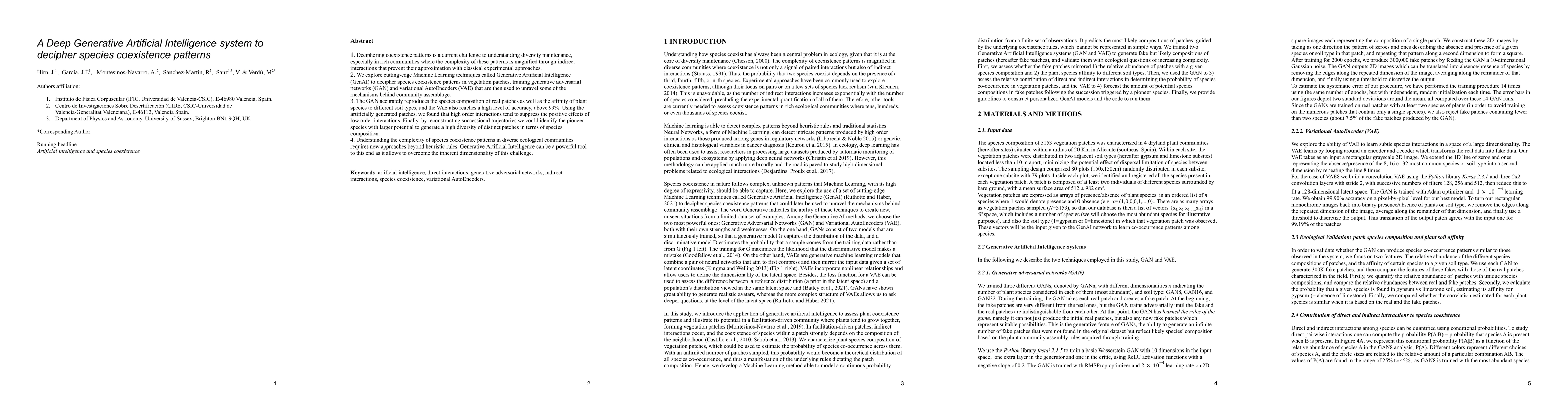 1. Deciphering coexistence patterns is a current challenge to understanding diversity maintenance, especially in rich communities where the complexity of these patterns is magnified through indirect interactions that prevent their approximation with classical experimental approaches. 2. We explore cutting-edge Machine Learning techniques called Generative Artificial Intelligence (GenAI) to decipher species coexistence patterns in vegetation patches, training generative adversarial networks (GAN) and variational AutoEncoders (VAE) that are then used to unravel some of the mechanisms behind community assemblage. 3. The GAN accurately reproduces the species composition of real patches as well as the affinity of plant species to different soil types, and the VAE also reaches a high level of accuracy, above 99%. Using the artificially generated patches, we found that high order interactions tend to suppress the positive effects of low order interactions. Finally, by reconstructing successional trajectories we could identify the pioneer species with larger potential to generate a high diversity of distinct patches in terms of species composition. 4. Understanding the complexity of species coexistence patterns in diverse ecological communities requires new approaches beyond heuristic rules. Generative Artificial Intelligence can be a powerful tool to this end as it allows to overcome the inherent dimensionality of this challenge.