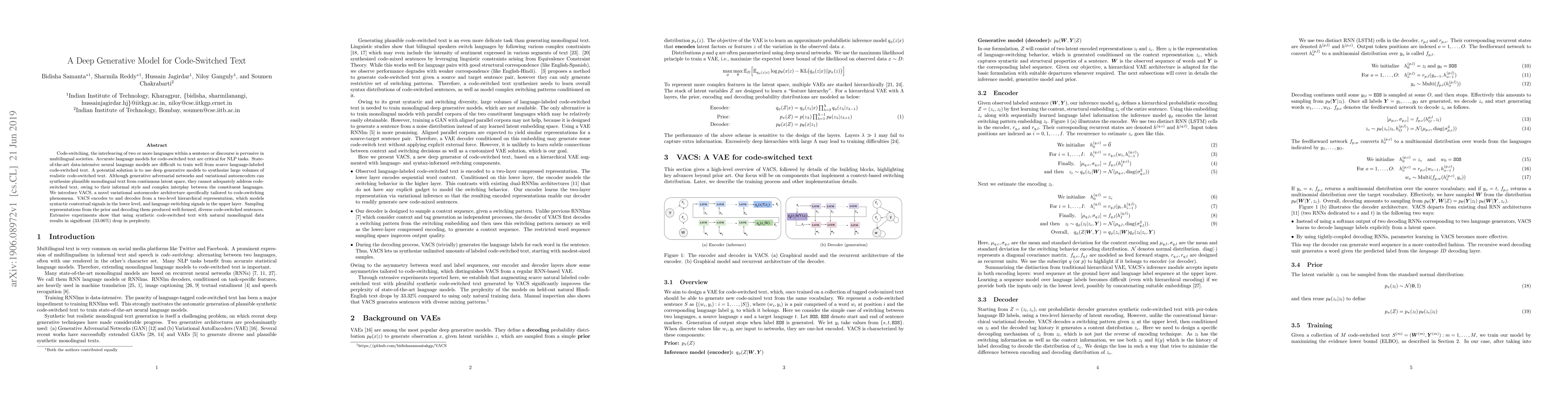 This paper proposes VACS, a variational autoencoder tailored for generating code-switched text by modeling syntactic and language switching signals. Experiments reveal that synthetic code-switched text improves perplexity when combined with natural monolingual data, achieving a 33.06% reduction.