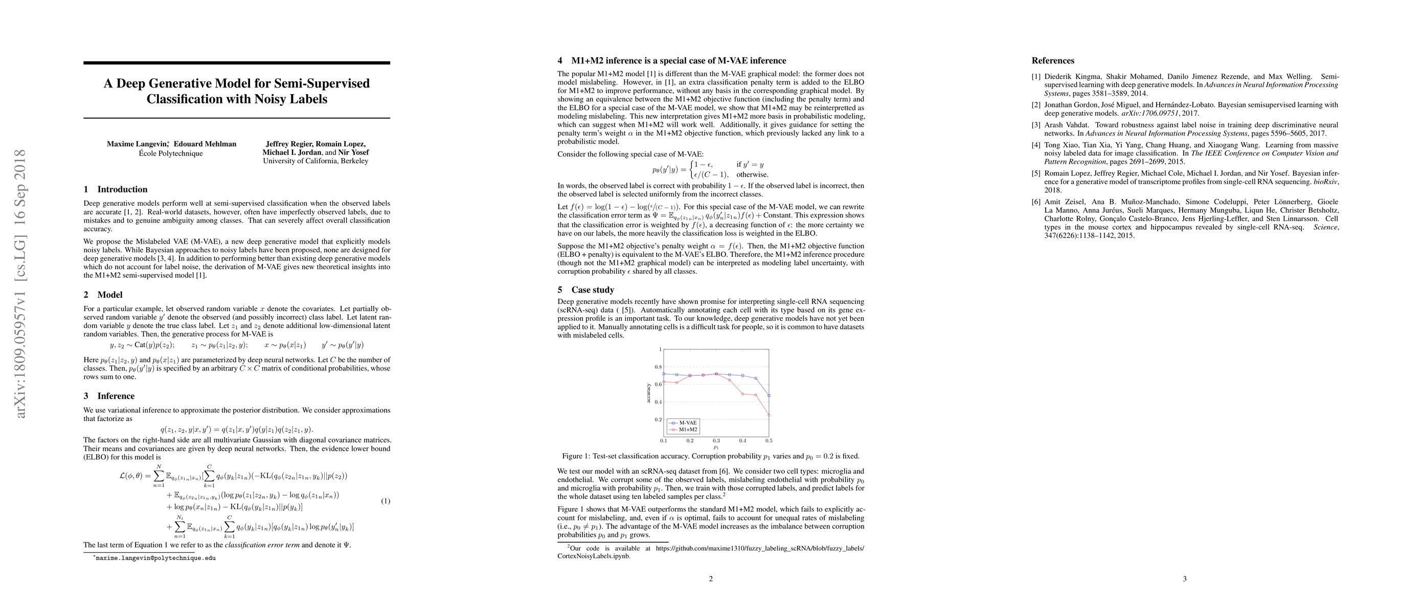This paper introduces a Mislabeled Variational Autoencoder (M-VAE) for semi-supervised classification that explicitly models noisy labels, outperforming existing models that ignore label noise. The M-VAE also provides new theoretical insights into the M1+M2 semi-supervised model.