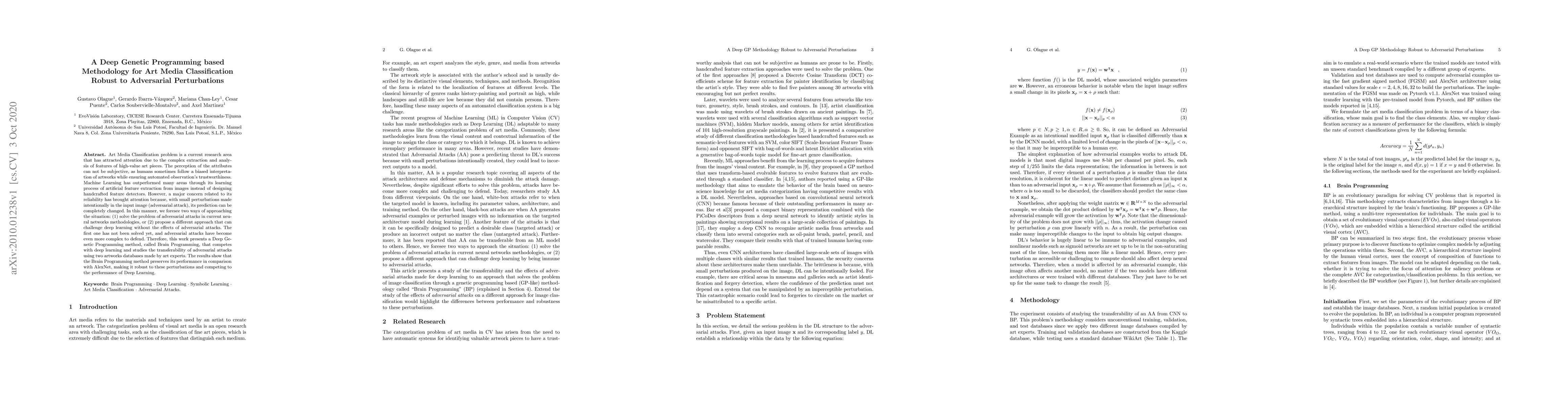 Art Media Classification problem is a current research area that has attracted attention due to the complex extraction and analysis of features of high-value art pieces. The perception of the attributes can not be subjective, as humans sometimes follow a biased interpretation of artworks while ensuring automated observation's trustworthiness. Machine Learning has outperformed many areas through its learning process of artificial feature extraction from images instead of designing handcrafted feature detectors. However, a major concern related to its reliability has brought attention because, with small perturbations made intentionally in the input image (adversarial attack), its prediction can be completely changed. In this manner, we foresee two ways of approaching the situation: (1) solve the problem of adversarial attacks in current neural networks methodologies, or (2) propose a different approach that can challenge deep learning without the effects of adversarial attacks. The first one has not been solved yet, and adversarial attacks have become even more complex to defend. Therefore, this work presents a Deep Genetic Programming method, called Brain Programming, that competes with deep learning and studies the transferability of adversarial attacks using two artworks databases made by art experts. The results show that the Brain Programming method preserves its performance in comparison with AlexNet, making it robust to these perturbations and competing to the performance of Deep Learning.