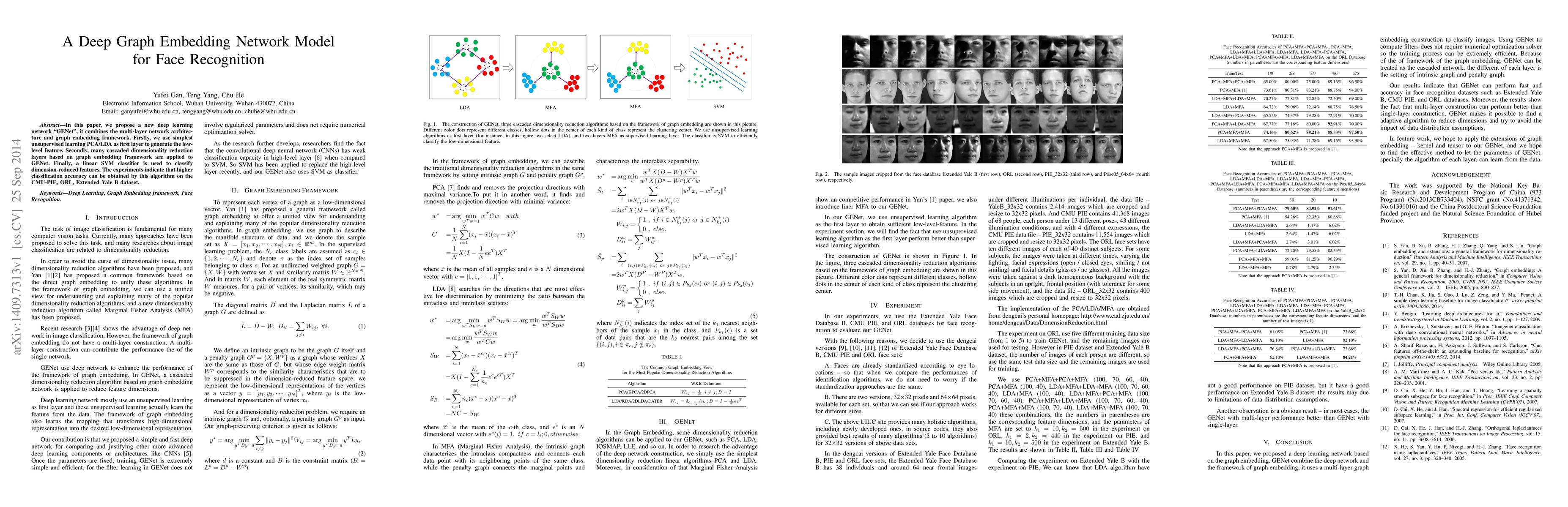 This paper introduces GENet, a deep learning network that combines multi-layer architecture and graph embedding for face recognition. It employs PCA/LDA for initial feature extraction and uses cascaded dimensionality reduction layers based on graph embedding, followed by an SVM classifier, achieving higher accuracy on CMU-PIE, ORL, and Extended Yale B datasets.