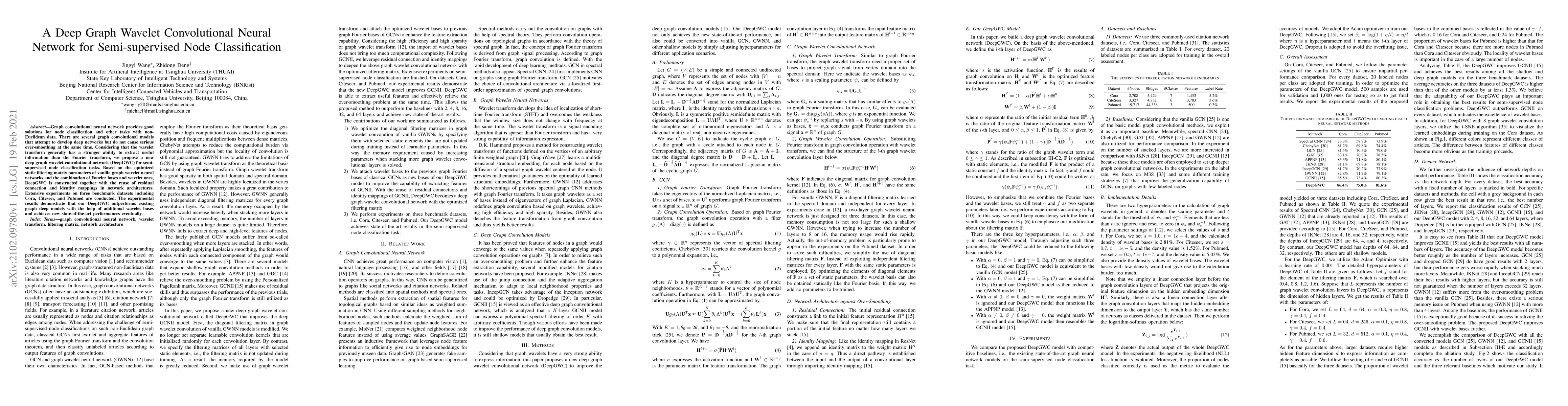 The paper proposes DeepGWC, a novel deep graph wavelet convolutional neural network that leverages wavelet transforms to enhance semi-supervised node classification, achieving state-of-the-art results on benchmark datasets by avoiding over-smoothing and utilizing residual connections. Experimental results outperform existing graph deep models on Cora, Citeseer, and Pubmed datasets.
