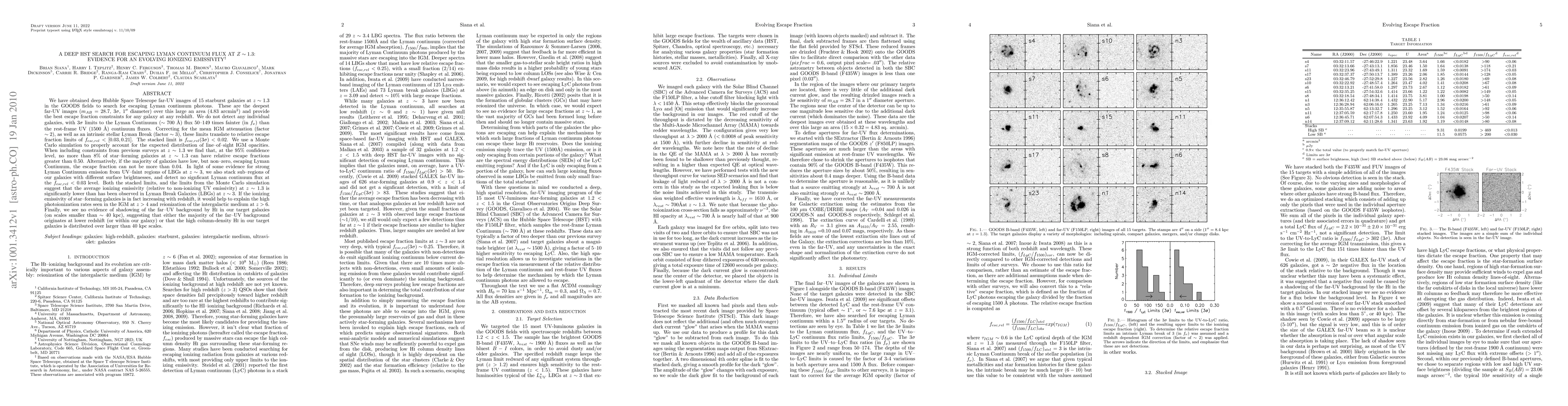 This research uses deep Hubble Space Telescope observations to search for escaping Lyman continuum photons in 15 starburst galaxies at z~1.3, finding no individual detections but constraining the relative escape fraction to be less than 0.21. The study suggests that the average ionizing emissivity at z~1.3 is lower than in higher redshift galaxies, indicating an evolving ionizing emissivity with redshift.
