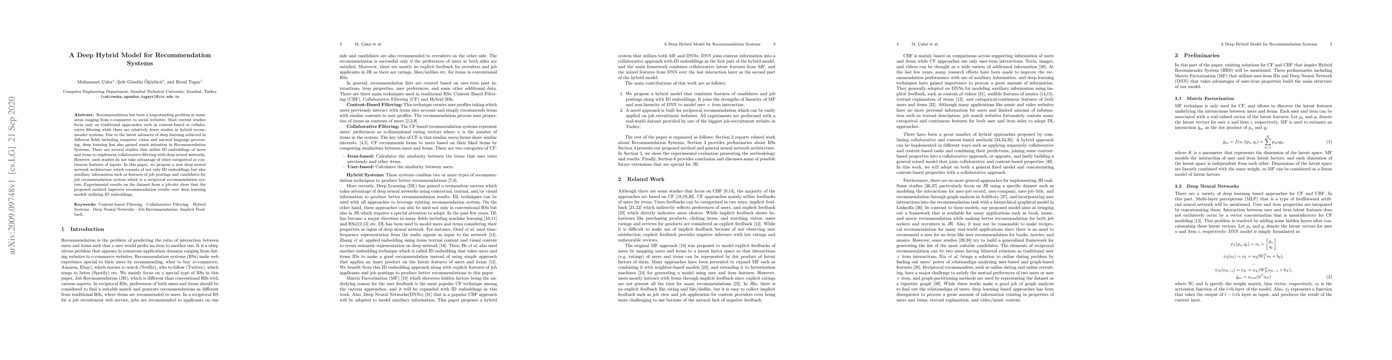 This paper proposes a deep hybrid model for recommendation systems that incorporates both ID embeddings and auxiliary categorical/continuous features, improving upon traditional deep learning approaches. Experimental results on a job recommendation dataset demonstrate superior performance compared to models relying solely on ID embeddings.